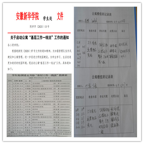 本网讯(通讯员:黄梦)为进一步强化beat365网登学生管理队伍建设,夯实学生管理工作基石,深入落实院学字【2021】13号文件《关于启动公寓“基层工作一线法”工作的通知 》,为学生学习、生活创造更好的校园环境,4月以来,学生处联合各二级学院开展公寓“基层工作一线法”工作。