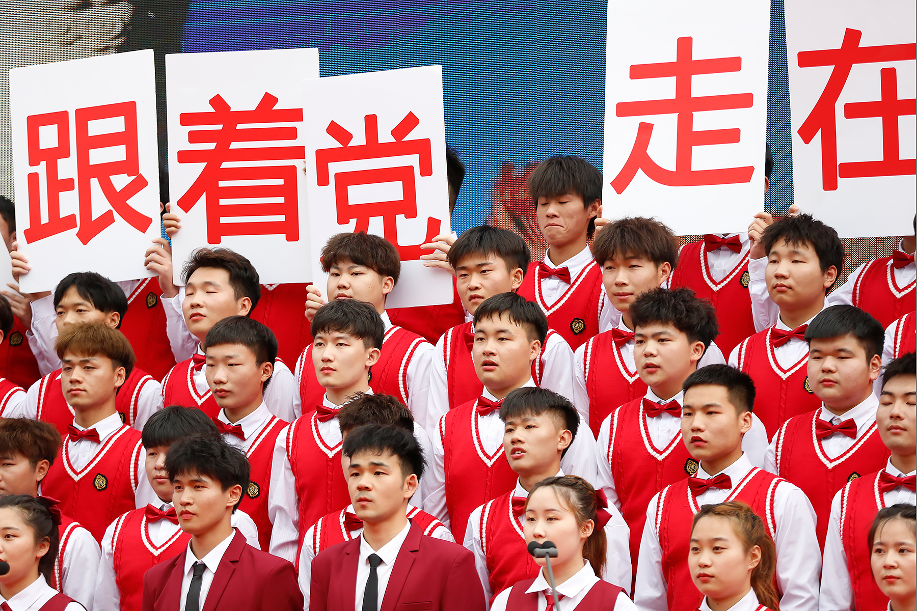 伴随着磅礴大气的前奏,波澜壮阔的气势喷薄而出。大数据与人工智能学院的《我们走在大路上》和电子工程学院/智能制造学院的《祖国不会忘记》富有动感、充满活力,绵延的情感中不乏坚定的声音。