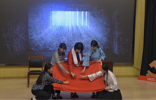 活动开始前,学生们分别通过情景朗诵《永不消逝的声音》、诗歌朗诵《七律·长征》、情景剧《绣红旗》演绎延安精神、长征精神、红岩精神,将全体党员师生思绪带回中国共产党领导中国人民夺取全国胜利和党中央筹建中华人民共和国的光辉历史,从而缅怀毛泽东同志等老一辈革命家的丰功伟绩。