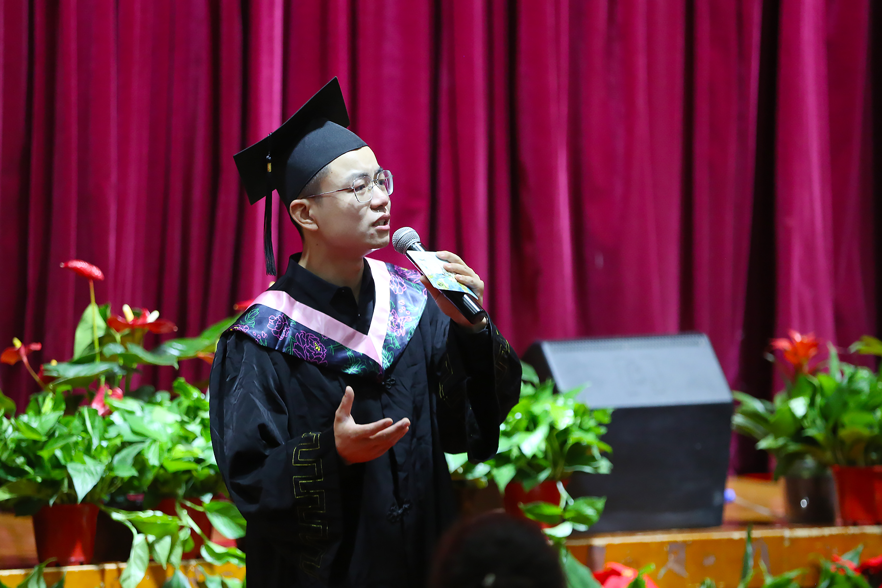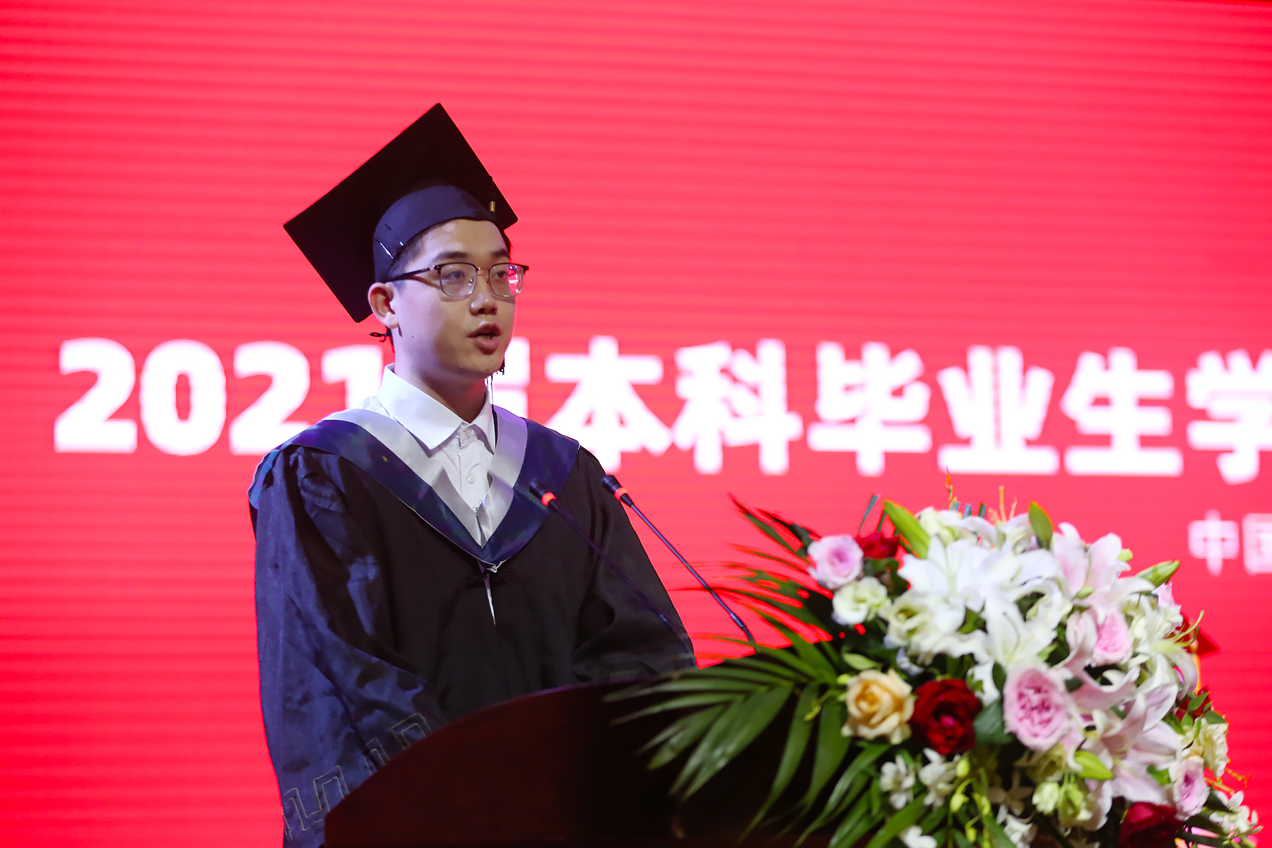 来自药学院的学生代表孙维浩同学发言:“回顾四年,最坚守的是‘初心’,最难忘的是‘关怀’。”