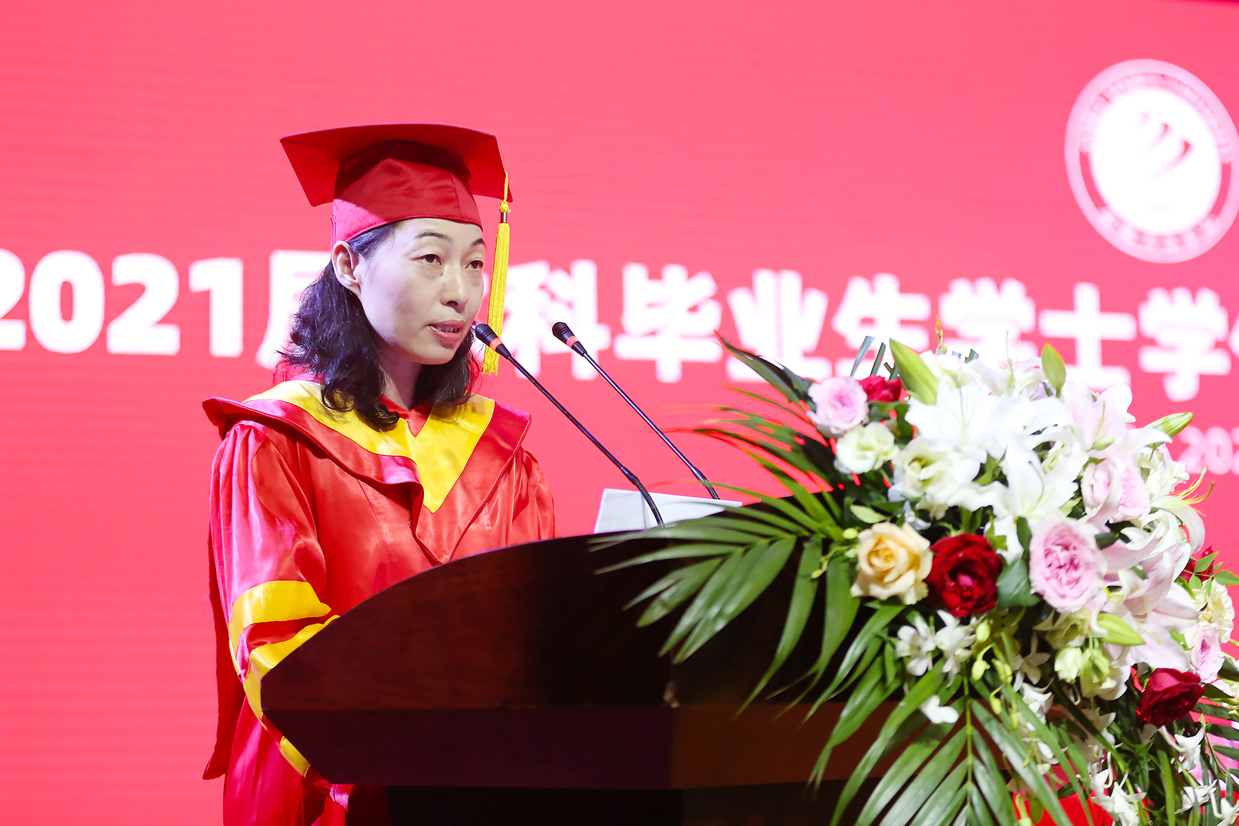 辅导员代表田园嘱咐毕业生:“坚持锻炼,保持健康体魄;优雅生活,感受世界美好;勇担职责,践行时代使命;积极探索,创造精彩人生。”