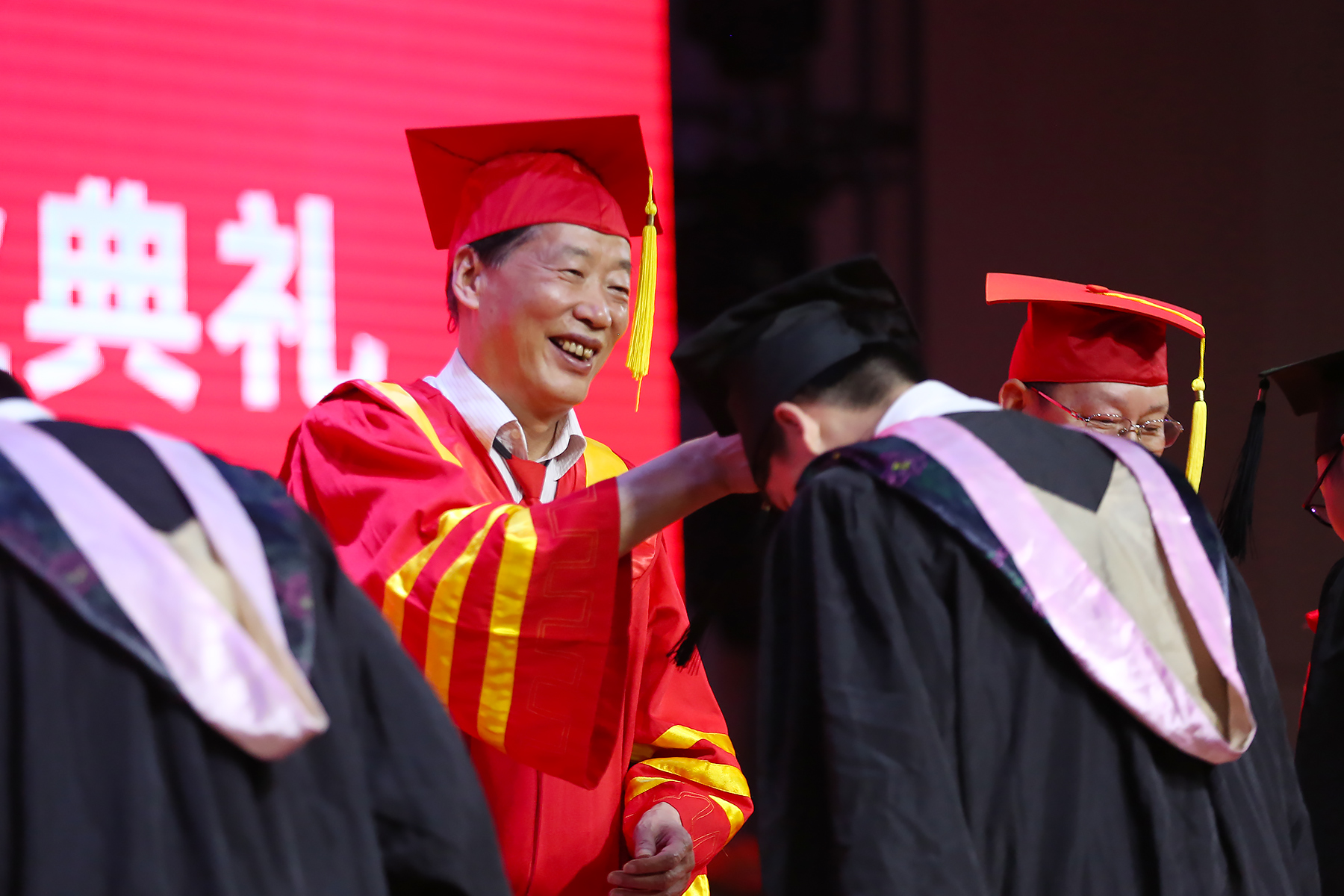 校领导为毕业生代表拨穗并颁发学士学位证书,“四载励志求学,一朝鲲鹏展翅”,祝贺他们顺利完成大学四年的学业。