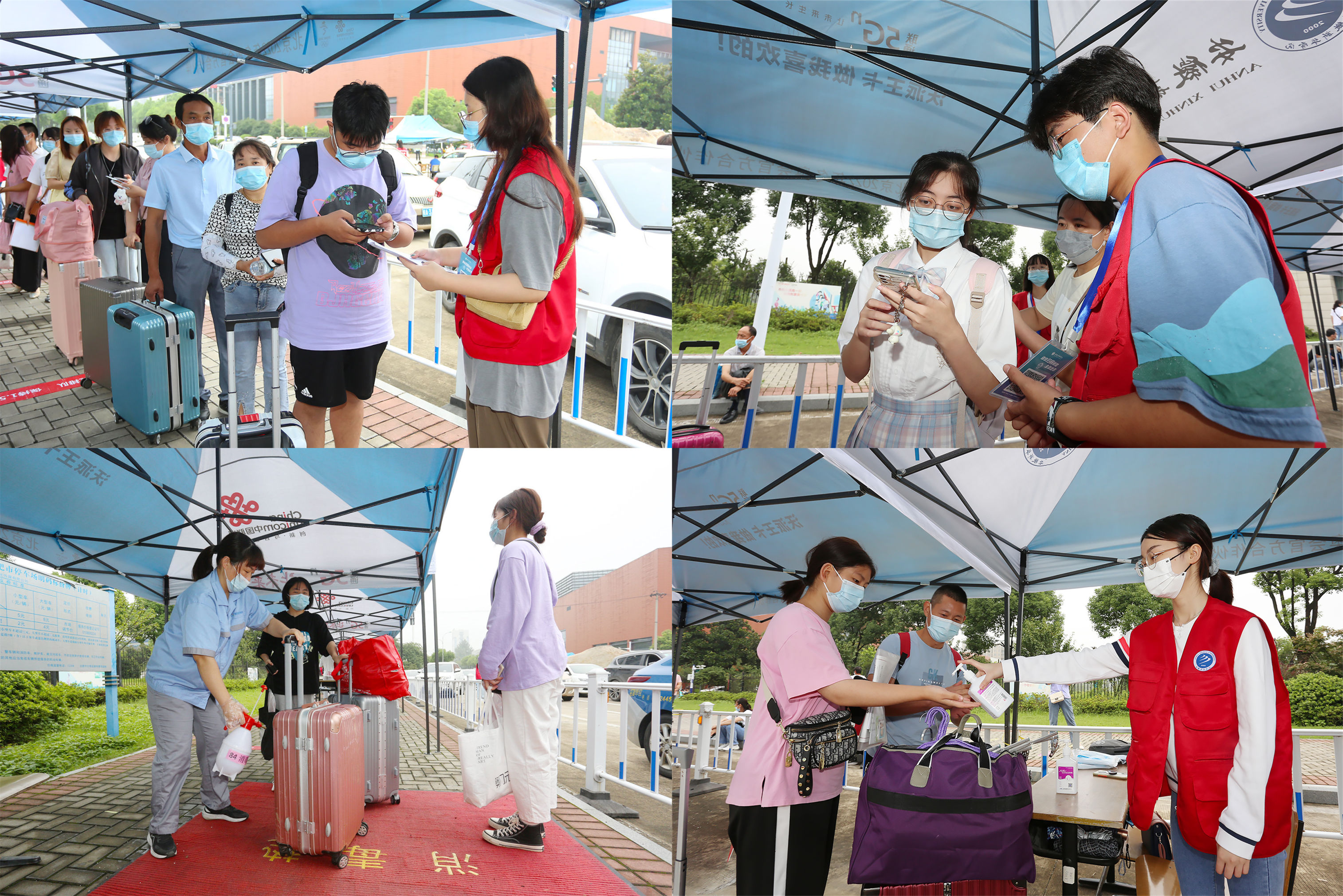 入校当天,beat365网登东门、西门开设了专用通道,工作人员和志愿者们清晨便已就位,迎接新生的到来。前来报到的新生在工作人员的引导下,佩戴口罩、间隔1米以上,有序穿过学校闸门,进入新生报到专用通道,在完成返校码、安康码、行程卡核验,手部清洁、更换口罩、测量体温、行李消杀等流程后,来到学院迎新展台和报到点正式办理报到手续,领取有关物品。