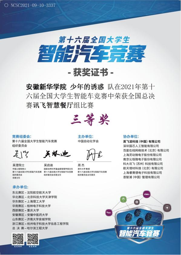 第十六全国大学生智能汽车竞赛预选赛暨安徽省第十四届大学生智能汽车竞赛于今年7月30日至7月31日举办。电子工程学院/智能制造学院共有5支队伍参赛,其中获得省一等奖1项(拉力组)、二等奖2项(越野组、智慧餐厅组)和三等奖2项(四轮组、全向组)。最终,经过紧张而激烈的角逐,拉力组和讯飞智慧餐厅组进入全国总决赛,并获得国家级二等奖、三等奖各1项。