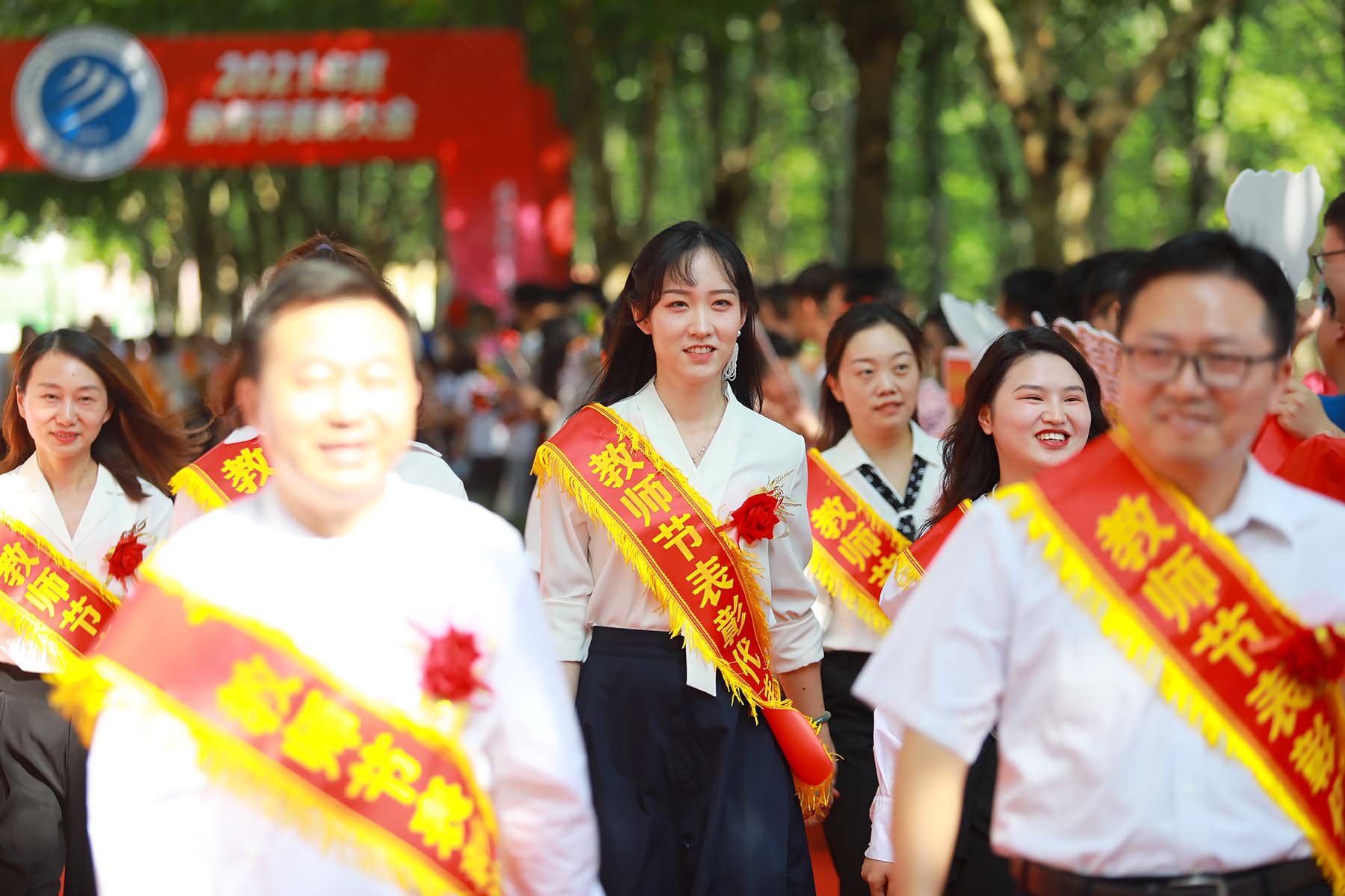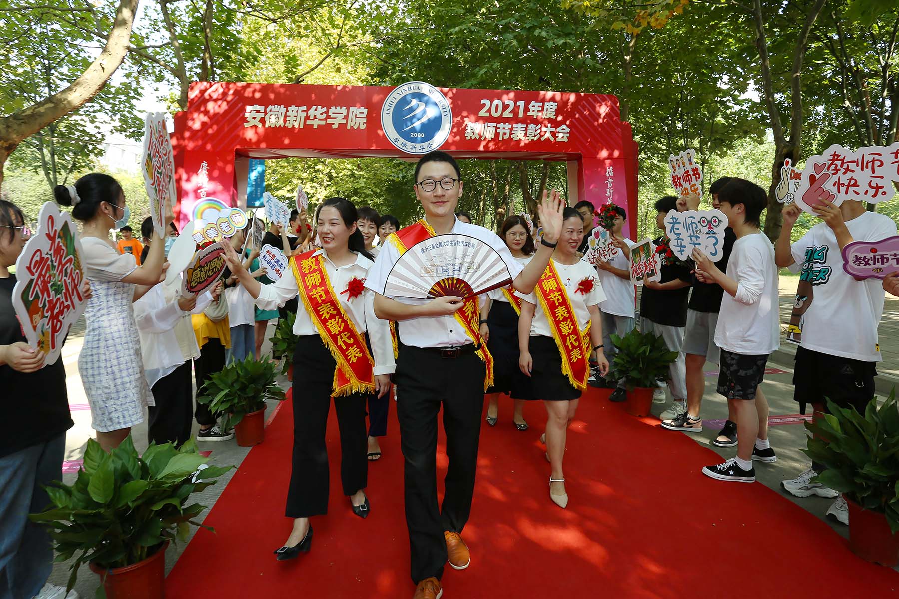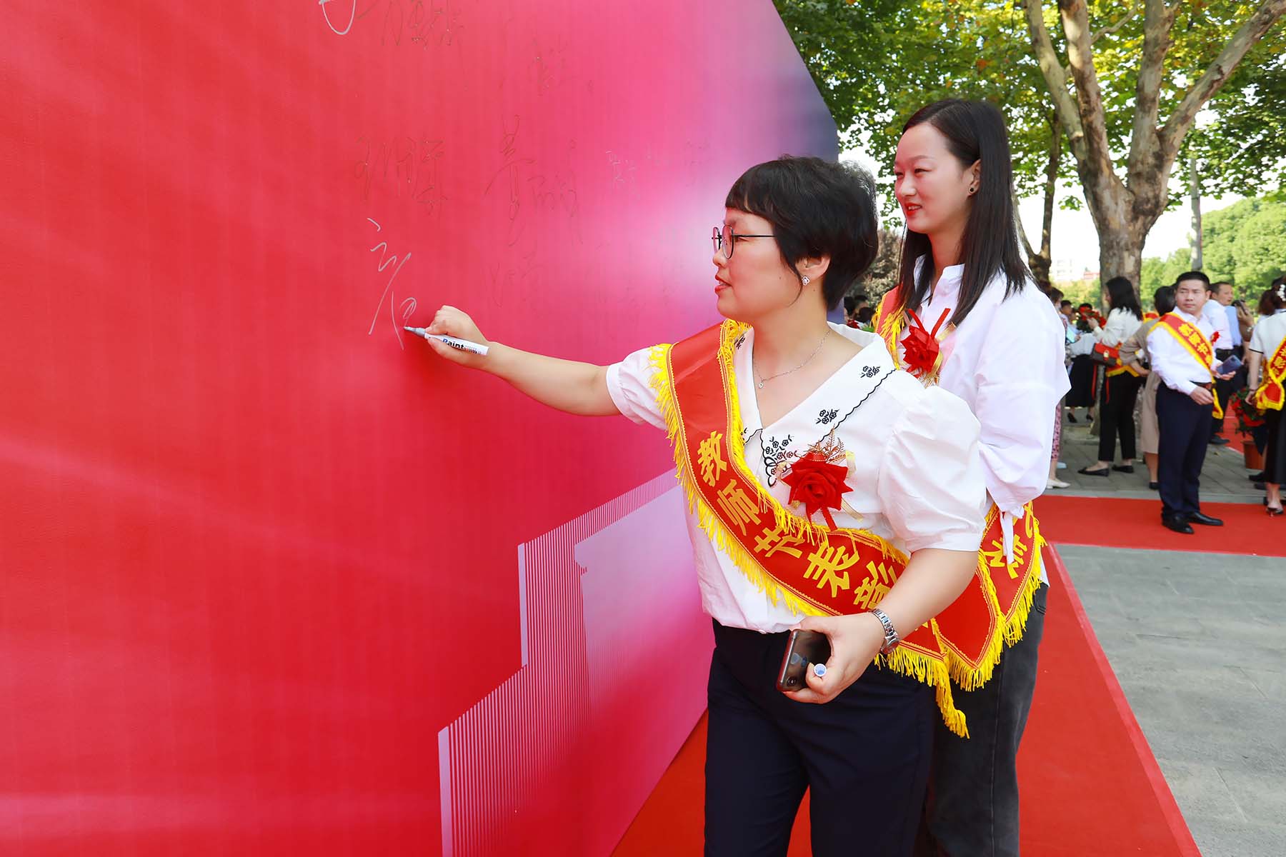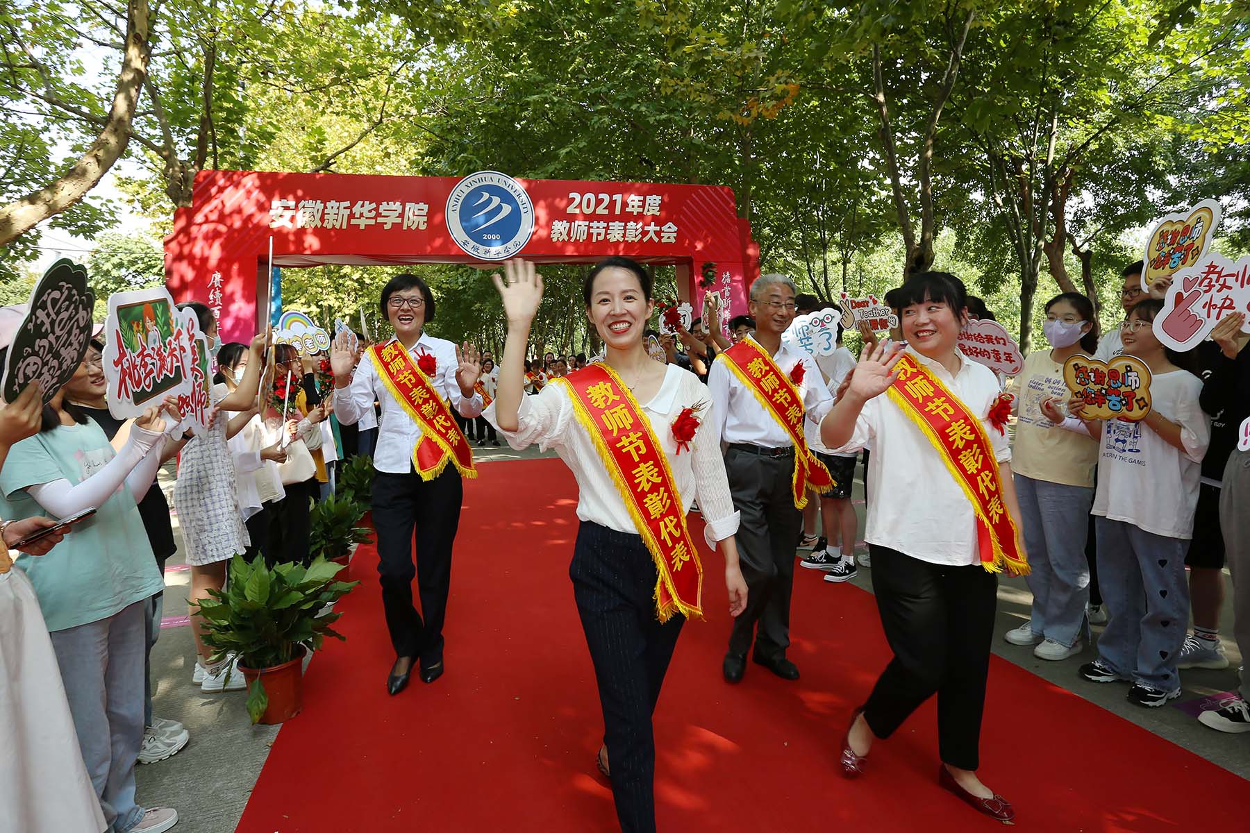 下午3时,秋实路上,如琴湖畔,阳光温暖,秋风宜人。红毯“走秀”正式开始,受表彰的老师们迈着自信、从容的步伐,在师生们热烈的掌声和欢呼声中走过红毯,在签名墙前签名留念。