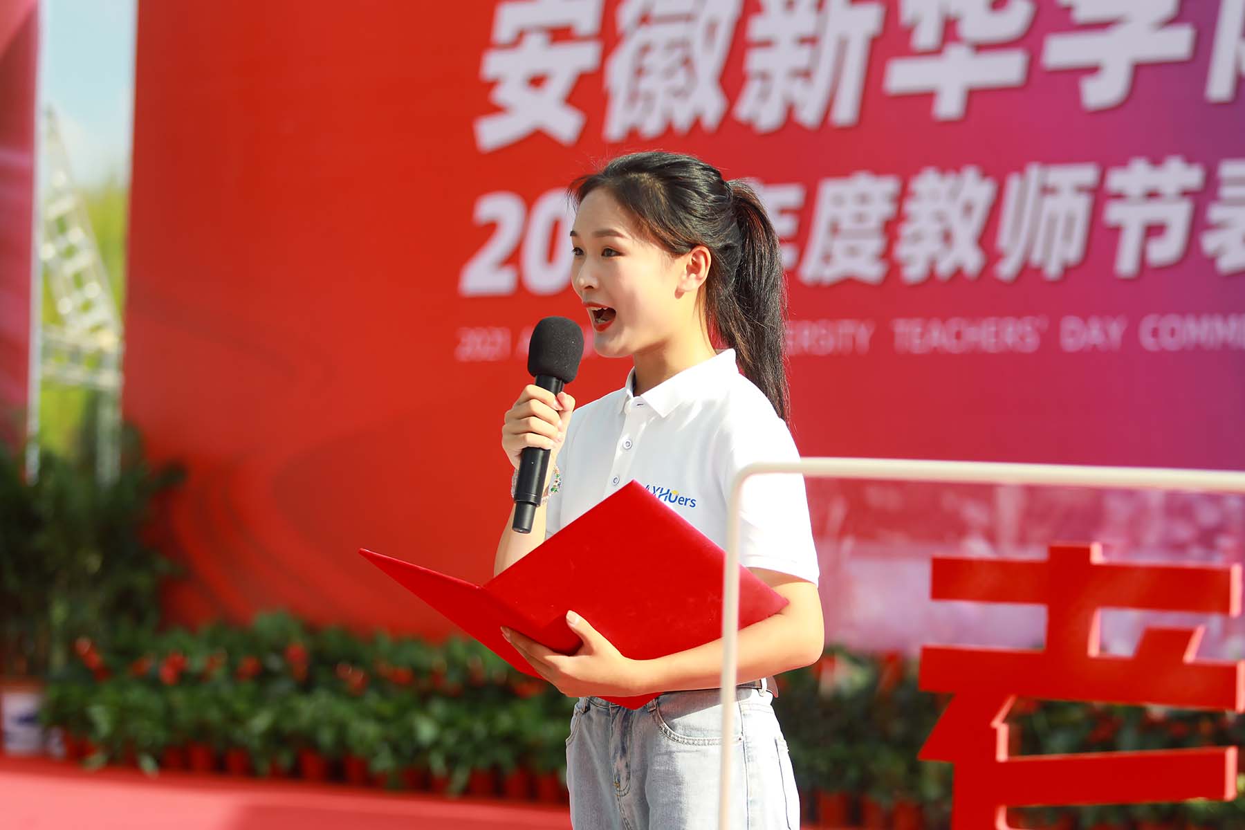 在新华园里,每天都发生着很多教育故事,拼搏的故事,坚持的故事,老师们和学生们点点滴滴的故事,汇聚成了可歌可泣的新华故事。一段诗朗诵《九月赞歌》将表彰大会推向高潮。
