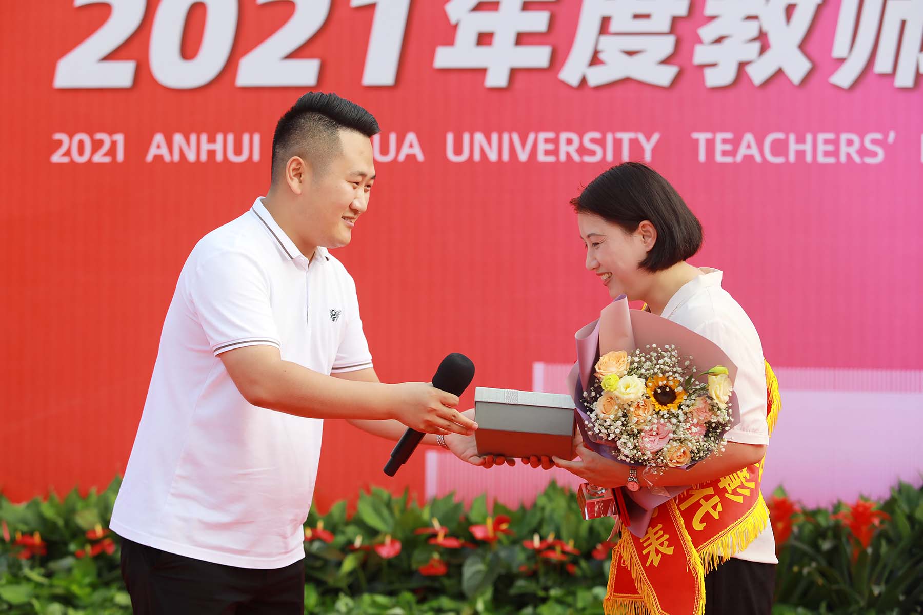第一篇章表彰了国家级、省级“学科与科技竞赛指导教师”“艺体类国家奖项指导教师”“最美辅导员”、 省级“第十三届高校辅导员年度人物”“最受欢迎教师”。学生代表为获奖教师颁奖,并手持鲜花,送上节日的祝福。