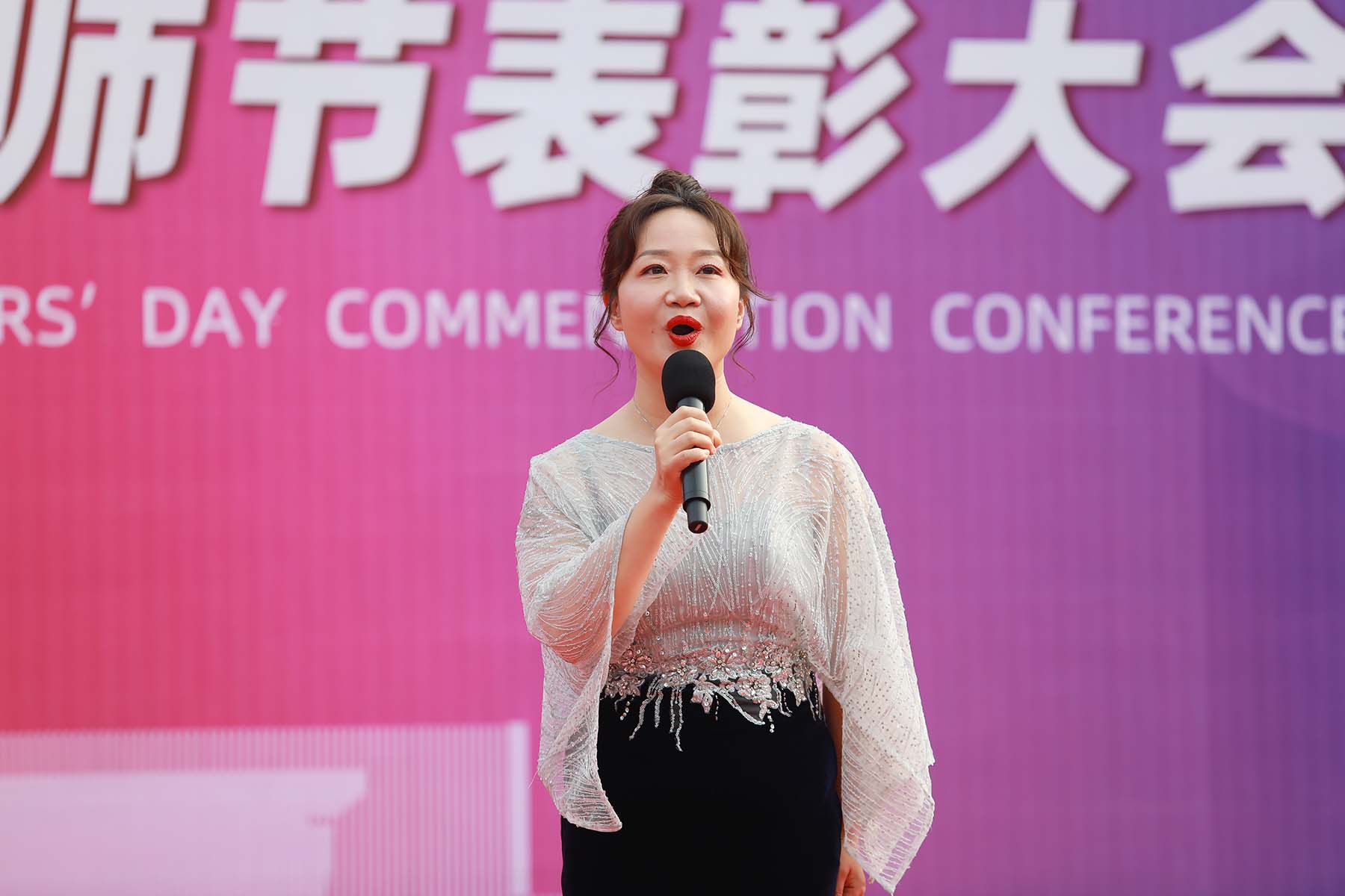 “新长征路上老师立新功,一群群接班人茁壮成长,肩负祖国希望奔向四方,您总是含泪深情凝望……”一曲《每当我走过老师窗前》合唱正式拉开了表彰大会的序幕。