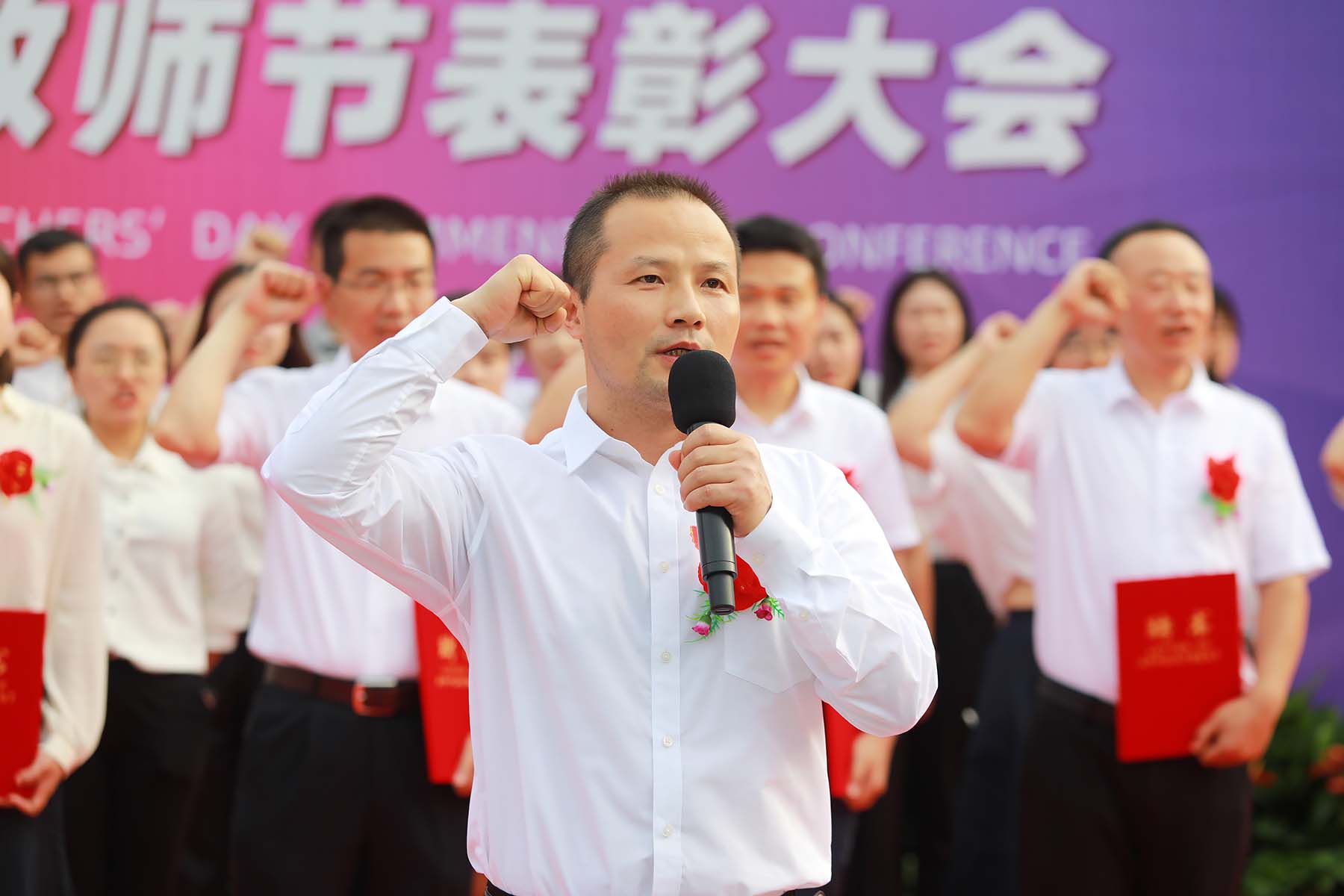 “小时候我以为你很有力,你总喜欢把我们高高举起。长大后我就成了你,才知道那个讲台举起的是别人,奉献的是自己。”表彰大会在歌伴舞《长大后我就成了你》中落下帷幕。