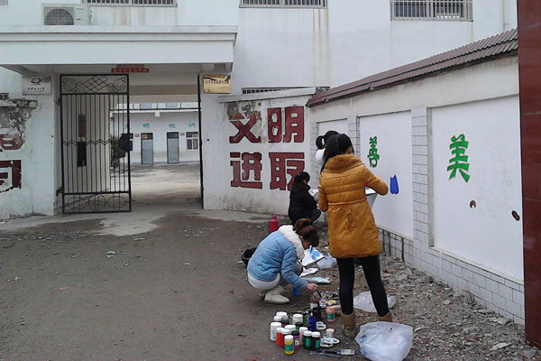 一幅幅精美的画面,一份份真挚的感情,志愿者们用自己的爱心为韩圩小学的小朋友们送去了十二份手绘墙报。由于学校的基础设施差,距离市区远,缺少美术老师,在韩圩小学的校园里,围墙壁面上,没有孩子们喜欢的卡通壁画。为了帮孩子们解决这个问题,从去年的一月份到年初,志愿者们前后奔赴肥西县三次,共为孩子们完成了12面主题分别为真、善、美、仁、谦、勤、爱、礼、孝、诚、信、义的墙面壁画。为了能圆满完成任务,志愿者们也下足了功夫。由于大多数人都不擅长美术,缺少材料,大家不仅在图书馆及网上找了大量的素材,还邀请了动漫学院的“外援”支持。