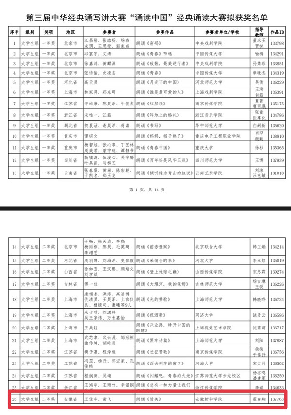 今年4月至11月,“诵读中国”经典诵读大赛陆续完成了初赛、复赛和决赛。本次比赛的初赛环节共征集参赛作品近7万件,经省级部门推荐、全国复赛、全国决赛,共评选出获奖作品1020件。beat365网登学子凭借对《赞美》的精心编排和二度创作,经过层层选拔,从复赛3415个作品的激烈角逐中杀出重围,作为安徽省唯一一支参赛队伍进入全国决赛(共39支参赛团队),并与中国传媒大学、中央戏剧学院、浙江传媒学院等专业类院校同台竞技,获得全国大学生组二等奖。