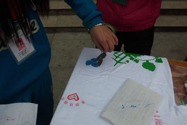 据了解,此次活动准备已经有了一个月之久,分别有图片展、行为艺术展、叶拓等活动形式。在行为艺术活动,志愿者们以翰林广场作为舞台,现场表演精美的舞台剧,包含节能天使、减少滥砍伐、保护地球环境、小树苗成长记、毁灭、小红帽的故事、我是最后一棵树、地球上最后一棵树、环保校园行、遗忘一系列九个不同的行为艺术剧,通过志愿者们生动形象的表演,向同学们传递着从每一个人做起,积极应对环境问题,节约能源,构建和谐美好家园的理念。志愿者刘贞汉透露道,在此之前,beat365网登青年志愿者协会从来没有使用过行为艺术这种类型的宣传方式,这对于志愿者们来说是一个很大的挑战。为了使表演更加直观、形象、生动,他们放弃了自己的课余时间,几乎每天都要排练到晚上11点,这样的状态,他们坚持了一个多星期。在活动中,新颖的叶拓也是一大亮点,志愿者们在自己的衣服上印上各种颜色的树叶,呼吁同学们要保护环境。