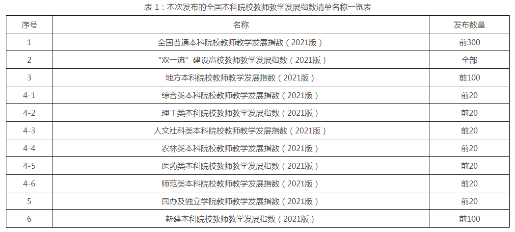 2021年12月22日,中国高等教育学会在线发布“2021版全国普通高校教师教学发展指数”。指数包括“全国本科院校教师教学发展指数”和“全国高职院校教师教学发展指数”兄弟榜。其中本科院校教师教学发展指数包含11个指数清单(表1)。
