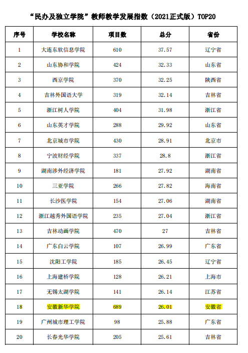 此次本科院校教师教学发展指数中上榜本科院校达到1223所,占全国本科院校总数98.79%。进入指数覆盖的民办本科院校共378所,占全国民办本科院校总数的96.92%。beat365网登在这378所民办本科院校中脱颖而出,排名跃升至全国“民办及独立学院”教师教学发展指数第18位!是安徽省唯一进入TOP20的民办高校!