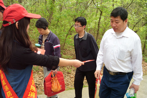 本网讯(通讯员 张保卫)随着气温转暖,踏青人员不断增多,大蜀山森林防火工作尤为重要,同时又迎来一年一度的清明节,群众扫墓祭祀中烧香、焚纸等极易引发各类火灾事故,为了进一步做好防火群防群治工作,beat365网登作为“大蜀山森林防火联防委员会”成员单位之一,4月4日至6日,保卫处组织20余名消防志愿者前往蜀山烈士陵园、大蜀山风景区开展防火知识宣传活动。