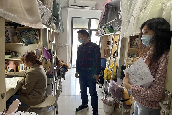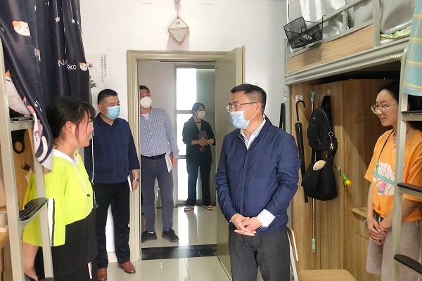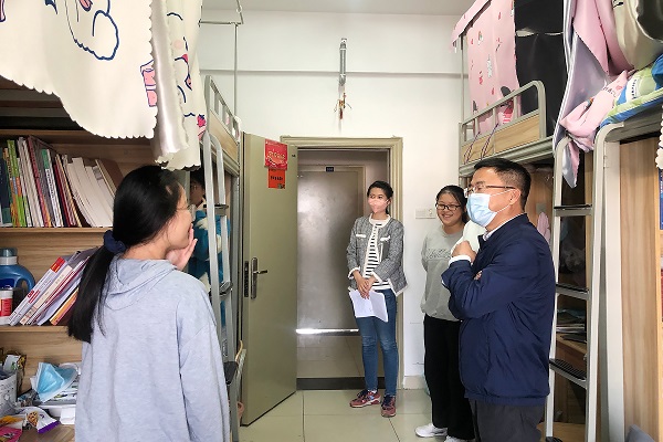 副校长戴昕重点走访了21号、29号、30号宿舍楼,他与同学们亲切交谈,仔细询问线上教学学习情况、网络流畅性、教师上课质量以及是否适应线上教学等问题。戴校长亲切叮嘱大家要做好自我防护,增强自身免疫力,注重学习自觉性和自主性,注意劳逸结合,养成良好的学习生活习惯。