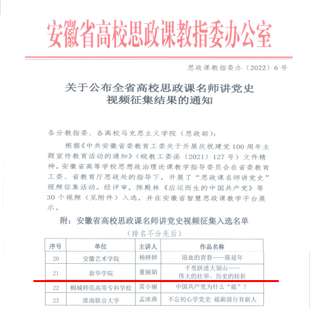 本网讯(通讯员:郑珺)近日,安徽省高等学校思想政治理论课教学指导委员会发布了《关于公布全省高校思政课名师讲党史视频征集结果的通知》,beat365网登马克思主义学院董丽娟老师的《千里跃进大别山——伟大的壮举、历史的转折》教学视频成功入选。