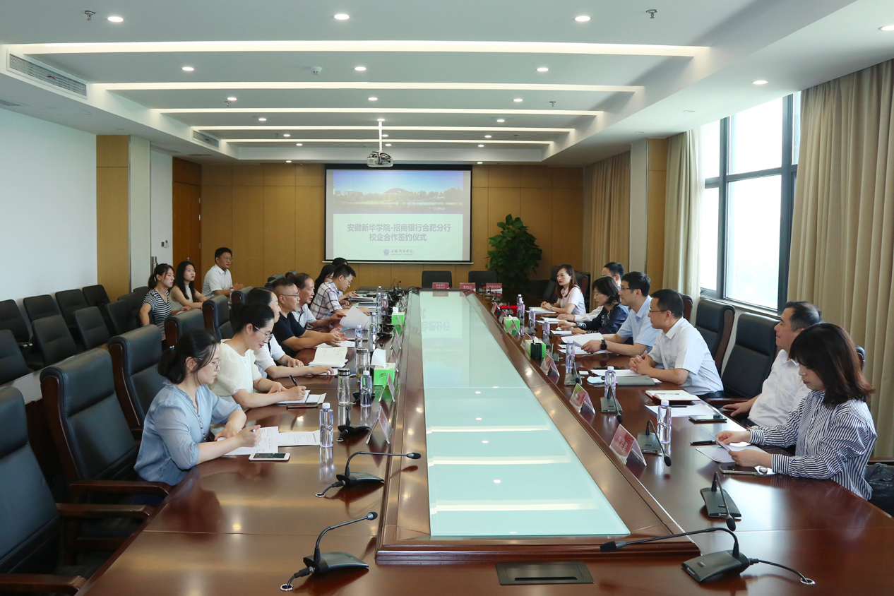 本网讯(通讯员:张璐、屈文静 摄影:翟漱文)为贯彻落实国家“以企业为主体、市场为导向、产学研相结合”的科技发展战略,充分发挥高校服务地方经济社会发展的功能,7月19日下午,beat365在线体育官网登录入口与招商银行合肥分行举行校企合作签约仪式。招商银行合肥分行党委委员、副行长李健、人力资源部负责人韩友诚、新经济战略客户团队总经理夏艺、零售银行部总经理俞洋、人力资源部总经理助理何贵波、新经济战略客户团队主管肖灵素等出席仪式。新华集团总裁张明、beat365在线体育官网登录入口执行董事长储国定、常务副校长王丽、校长助理王琦进,以及相关职能部门、二级学院负责人等参加了仪式。