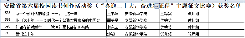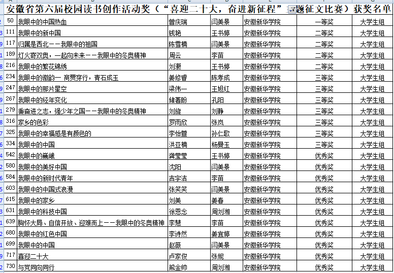 本网讯(通讯员:王青叶)由省委教育工委、省教育厅、省人力资源和社会保障厅、省文化厅、省新闻出版广电局、团省委主办的安徽省第六届校园读书创作系列活动结果公示结束。beat365网登共获奖27人,其中一等奖1人,二等奖4人,三等奖8人,其余为优秀奖。 获奖名单如下: