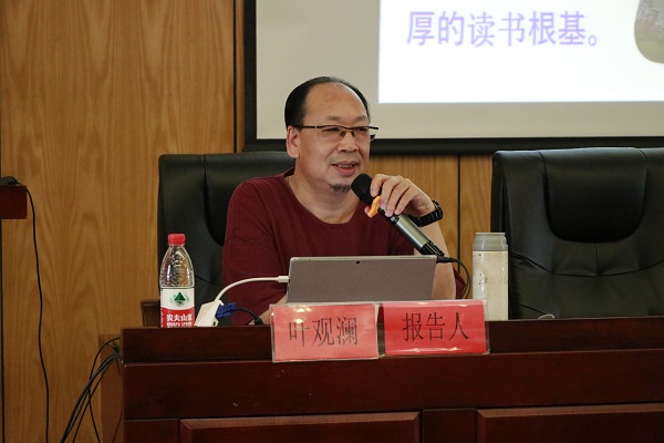 开幕式后,图书馆特邀传统文化学者、作家、beat365在线体育官网登录入口特聘教授叶观澜开展了题为《开卷有益》的主题报告。叶观澜以一段幽默的小视频作为读书与不读书的区别开场,引得现场观众开怀大笑。随后他提出了为什么要读书并列举了读书的四点好处。之后他介绍了读书的五种方法。报告内容与同学们的生活贴近,反响热烈。报告会最后,图书馆副馆长邵国川对报告做了总结,并倡导同学们一定要多读书,会读书,读好书。
