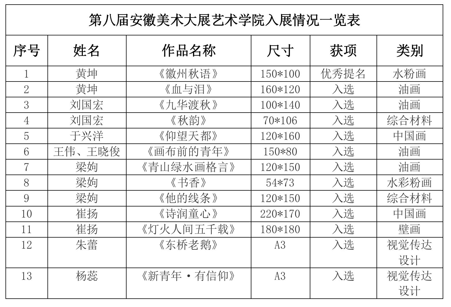 艺术学院9位教师创作的13幅作品入选“第八届安徽美术大展”,其中黄坤老师的一幅作品获得优秀提名。据悉,“第八届安徽美术大展”是由安徽省文联、安徽省美协主办的省内最重要的综合性美术作品展览展示活动,也是为备战第十四届全国美术作品展览,推动创作的重要活动。