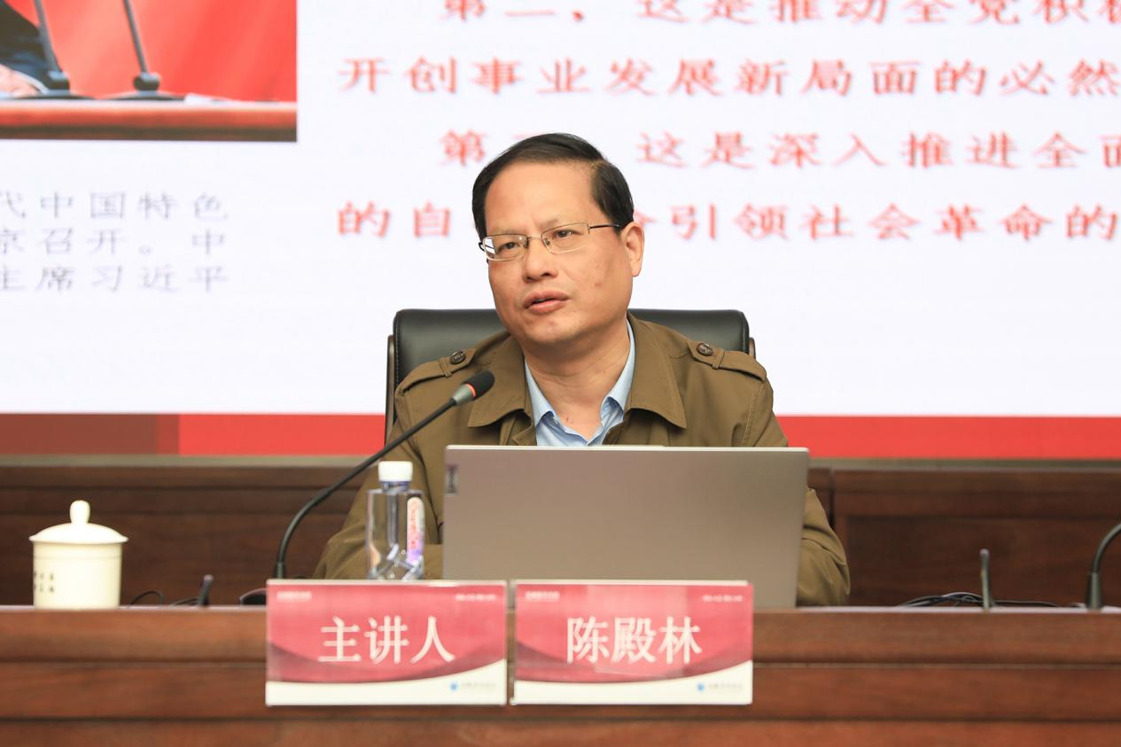 会议第二阶段,安徽省委讲师团高端宣讲专家、合肥工业大学教授陈殿林作《全面建设社会主义现代化国家》专题报告,马克思主义学院院长何小刚主持。