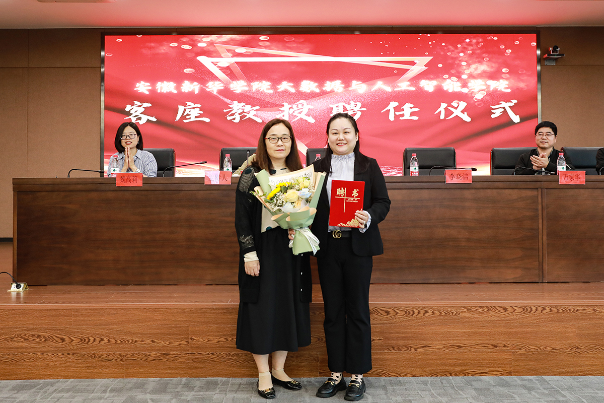 本网讯(通讯员:石文玉)5月26日下午,大数据与人工智能学院在beat365网登科研楼二楼多功能厅举行了客座教授聘任仪式,聘请合肥城市云数据中心股份有限公司副总经理李晓洁为大数据与人工智能学院的客座教授。校长助理盛晓青出席了聘任仪式,大数据与人工智能学院教职工代表和学生代表参加了本次活动。仪式由大数据与人工智能学院副院长(主持)郑妮主持。