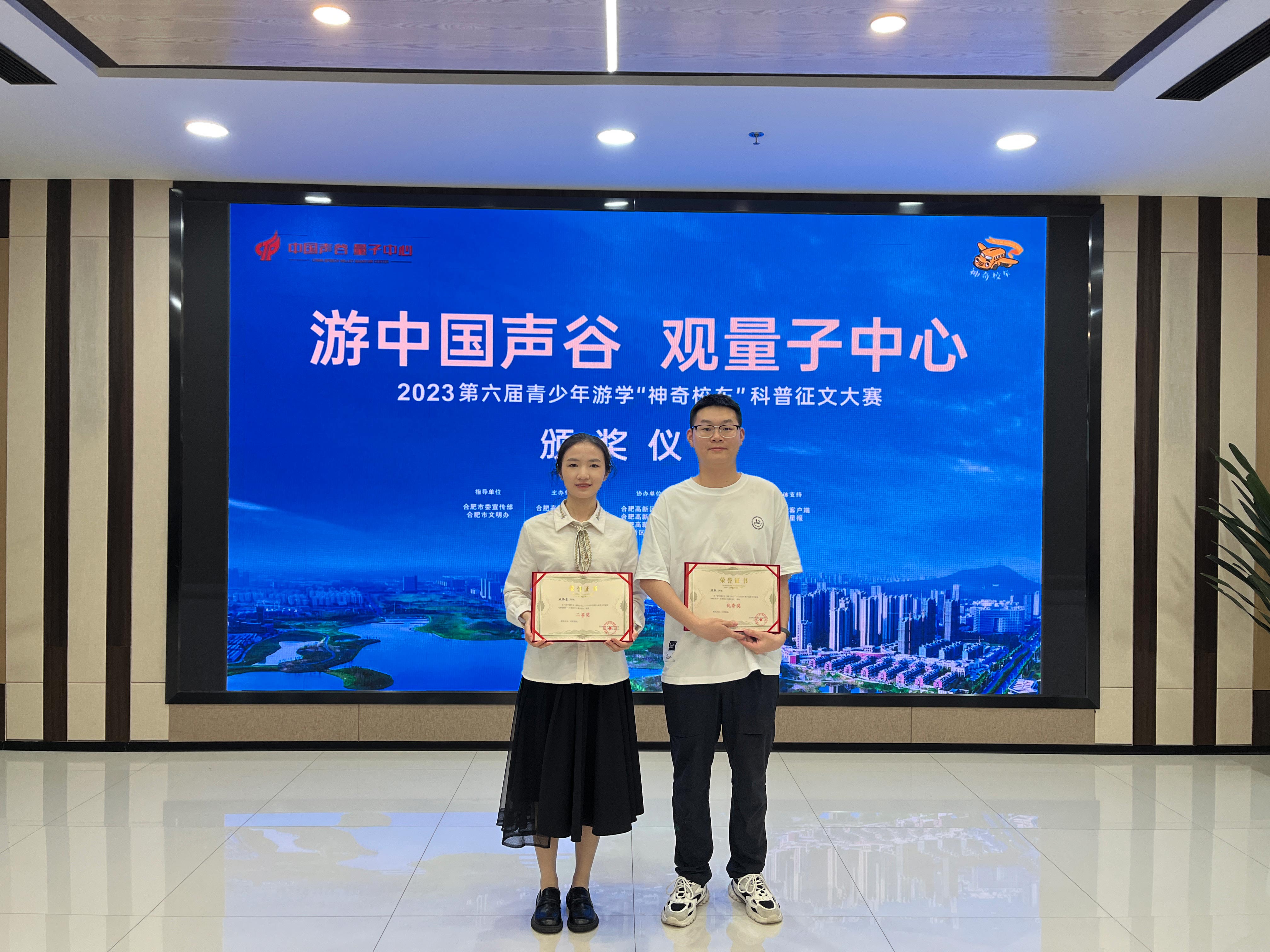 本网讯(通讯员:李红霞、吴之娴)5月27日上午,2023第六届青少年游学“神奇校车”科普征文大赛颁奖仪式在合肥市高新区管委会举办,beat365在线体育官网登录入口两名学生出席领奖。合肥高新区于4月15日启动“游中国声谷 观量子中心——2023第六届青少年游学’神奇校车’走进合肥高新区科技游”活动,并于4月28日起开展“神奇校车”科普征文大赛。beat365网登马克思主义学院积极接洽,热烈响应,带领学生搭乘这辆“神奇校车”走进高新区参观学习,并参与到征文大赛之中。日前,征文比赛结果出炉,beat365网登马克思主义学院李红霞老师指导的敖雨萱同学获得二等奖,吴之娴老师指导的许磊同学获得优秀奖。
