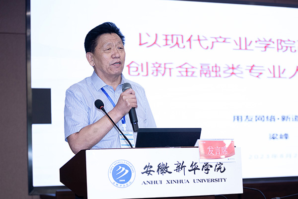 新道科技首席专家梁峰教授从现代产业学院高质量发展与创新人才培养模式角度发表演讲,介绍了现代产业学院的逻辑内涵,对其深度进行阐释,他指出要多维融通,打造“双向反哺”的教学新范式。