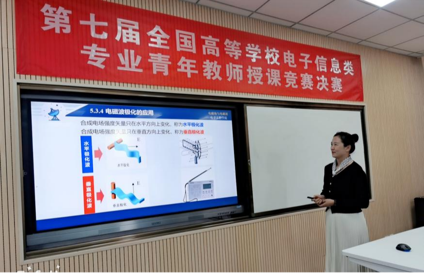 全国高等学校电子信息类专业青年教师授课竞赛是教育部高等学校电子信息类专业教学指导委员会以及工业和信息化部教育与考试中心主办,自2017年起至今已举办七届。大赛分预赛和决赛两个阶段。赵玉荣老师以华东赛区一等奖的预赛成绩进入决赛。决赛由6位国家级教学名师、25位省级教学名师和10位教指委委员组成评委会,对参赛教师现场教学内容、教学组织、教学手段、微课与教学内容结合、教学艺术、特色与效果等方面进行盲评打分。