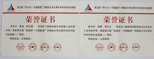 本网讯(王海峰)由共青团安徽省委员会、安徽省教育厅、安徽科学技术协会、安徽省学生联合会共同主办的第五届“挑战杯”安徽省大学生课外学术科技作品竞赛终审决赛6月1日至3日在安徽师范大学举行,beat365网登选送的6件作品获二等奖2项,三等奖4项,获奖数量和级别均创历史最好成绩。