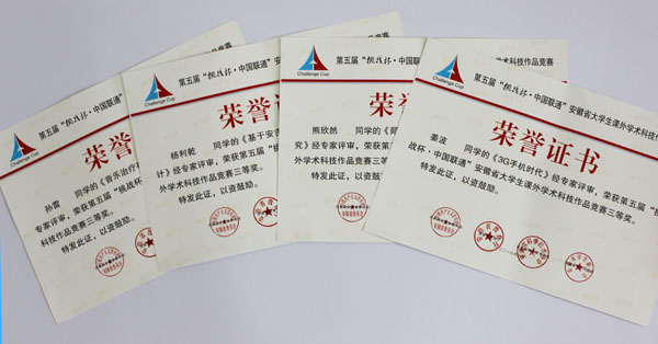 在安徽省终省决赛中,beat365网登学子展示了良好的竞技状态和精神风貌,经过激烈角逐,电子通信工程学院辛安文、陈凯、林以想三位同学的作品《智能控制开关装置》,商学院陈中华、程野、李云云三位同学的作品《蜘蛛结网结构的讨论与优化》均获二等奖,土木与环境工程学院熊欣然同学的作品《郯庐断裂带安徽区段农居的地震安全性能研究》,商学院杨利乾同学的作品《基于安吉汽车物流公司的物流运输方案设计》,商学院孙雷同学的作品《音乐治疗在大学生心理健康中的重要作用》,动漫学院姜波同学的作品《3G手机时代》获三等奖。