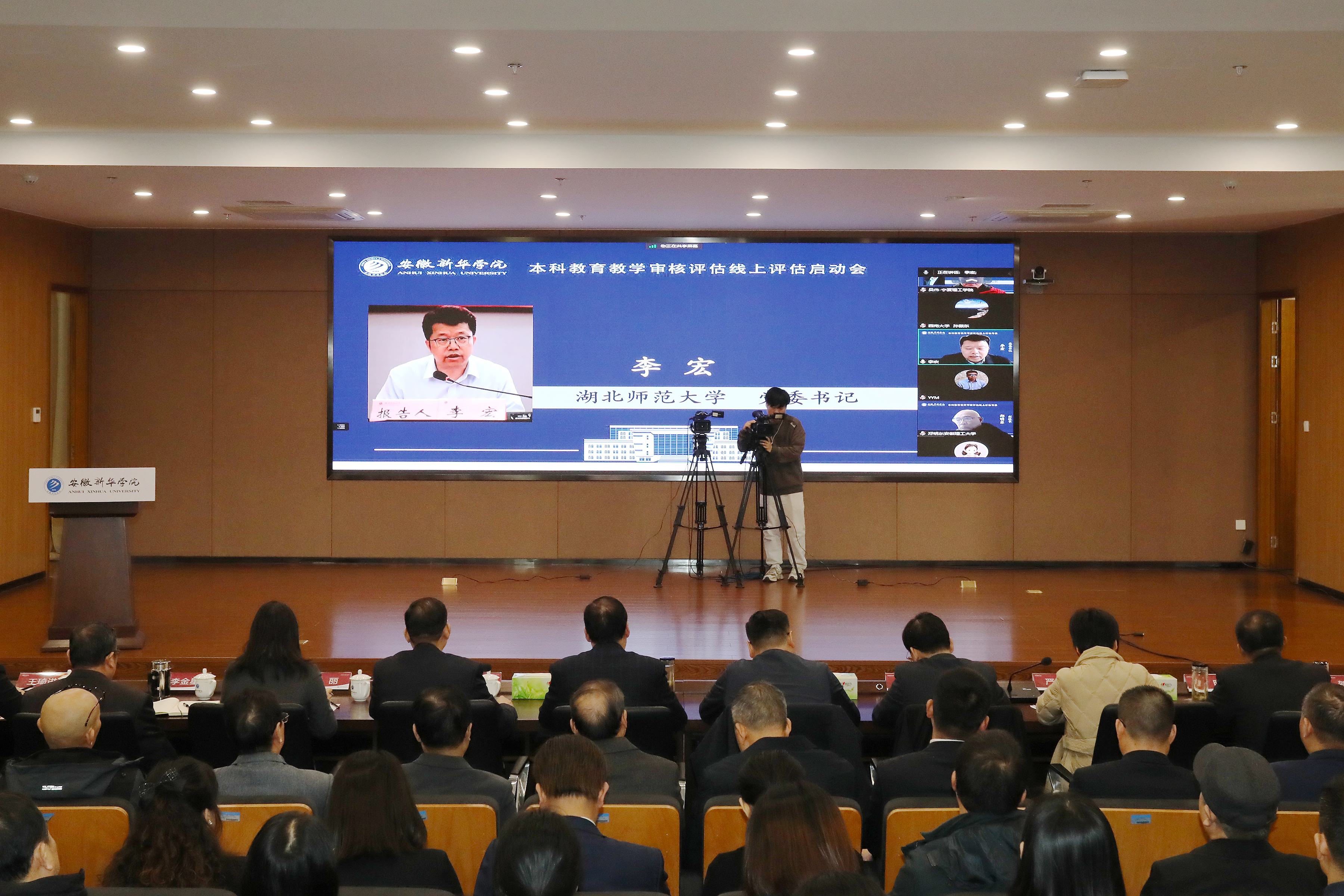 本网讯(通讯员:汪青 王亚君 摄影:翟漱文)11月13日,beat365网登召开教育部新一轮本科教育教学审核评估线上评审启动会。教育部本科教育教学审核评估专家组组长、湖北师范大学党委书记李宏及专家组全体成员,省教育厅评估中心负责人,新华集团领导和全体校领导出席会议。学校中层及以上管理人员,校级督导代表、教师代表、学生代表参加会议。会议采取“线上+线下”相结合的形式召开,第一阶段由省督导专员、校党委书记邸建伟主持,第二阶段由专家组组长李宏主持。