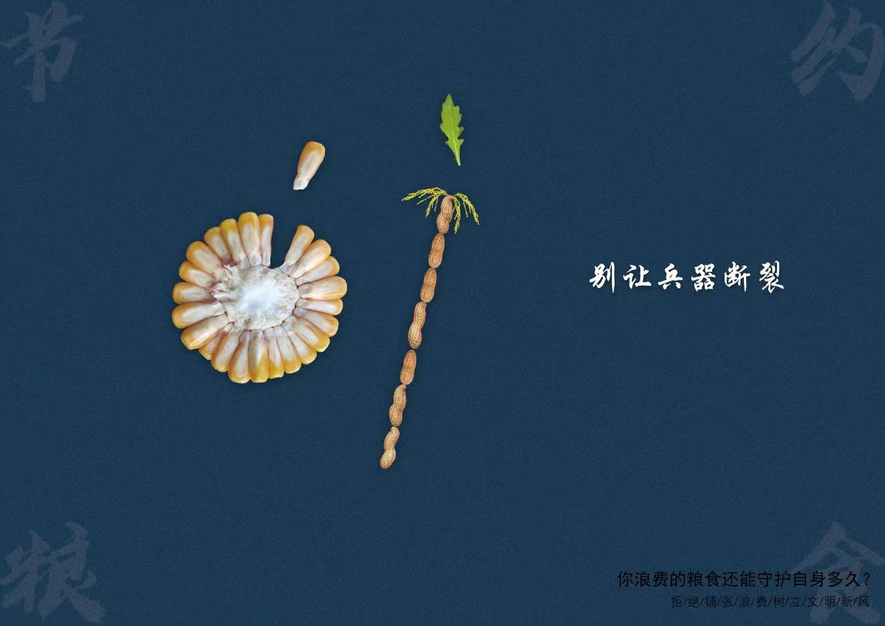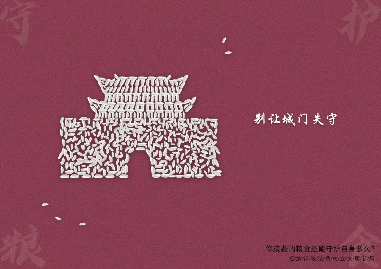《粮食安全亦是战场》以其独特视角、精巧的创意突出重围,在第五届安徽省优秀公益广告作品征集推选活动中崭露头角,荣获一等奖。该作品用多种粮食作物与“盔甲”“矛盾”“古城楼”进行创意结合,致力于体现粮食是守护自身、抵御“侵略”、保护国家的有利保障;用“破损的”盔甲、“断裂的”兵器、“失守的”城门寓意不珍惜粮食、浪费粮食的行为;用“你浪费的粮食会守护自身多久?”的反问句引人深思,欲告诫人们要节约粮食勿浪费,要维护好粮食安全。