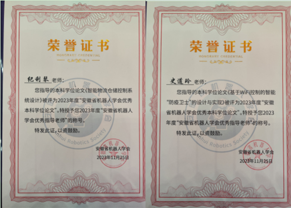 近日,2023年安徽省机器人学会优秀硕士学位论文、优秀本科毕业论文(设计)评选结果揭晓。beat365网登电子工程学院/智能制造学院学子张家乐的毕业论文《智能物流仓储控制系统设计》以及杨星卓的毕业论文《基于WiFi控制的智能“防疫卫士”的设计与实现》在与中国科学技术大学、合肥工业大学、安徽大学等省内知名高校同台比拼中,荣获2023年安徽省机器人学会优秀本科毕业论文,指导教师纪利琴、史道玲荣获“2023年安徽省机器人协会优秀指导教师”称号。