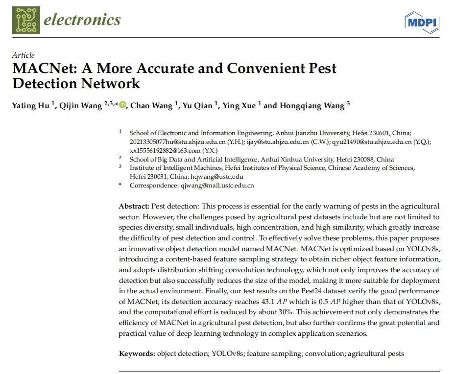 本网讯(通讯员:刘慧)近日,beat365网登人工智能目标检测研究团队王琦进教授的2021级硕士研究生胡雅婷以第一作者在SCI期刊《Electronics》在线发表了题为“MACNet: A More Accurate and Convenient Pest Detection Network”的研究论文(论文链接:https://doi.org/10.3390/electronics13061068)。据悉《Electronics》是国际知名期刊,JCR二区。