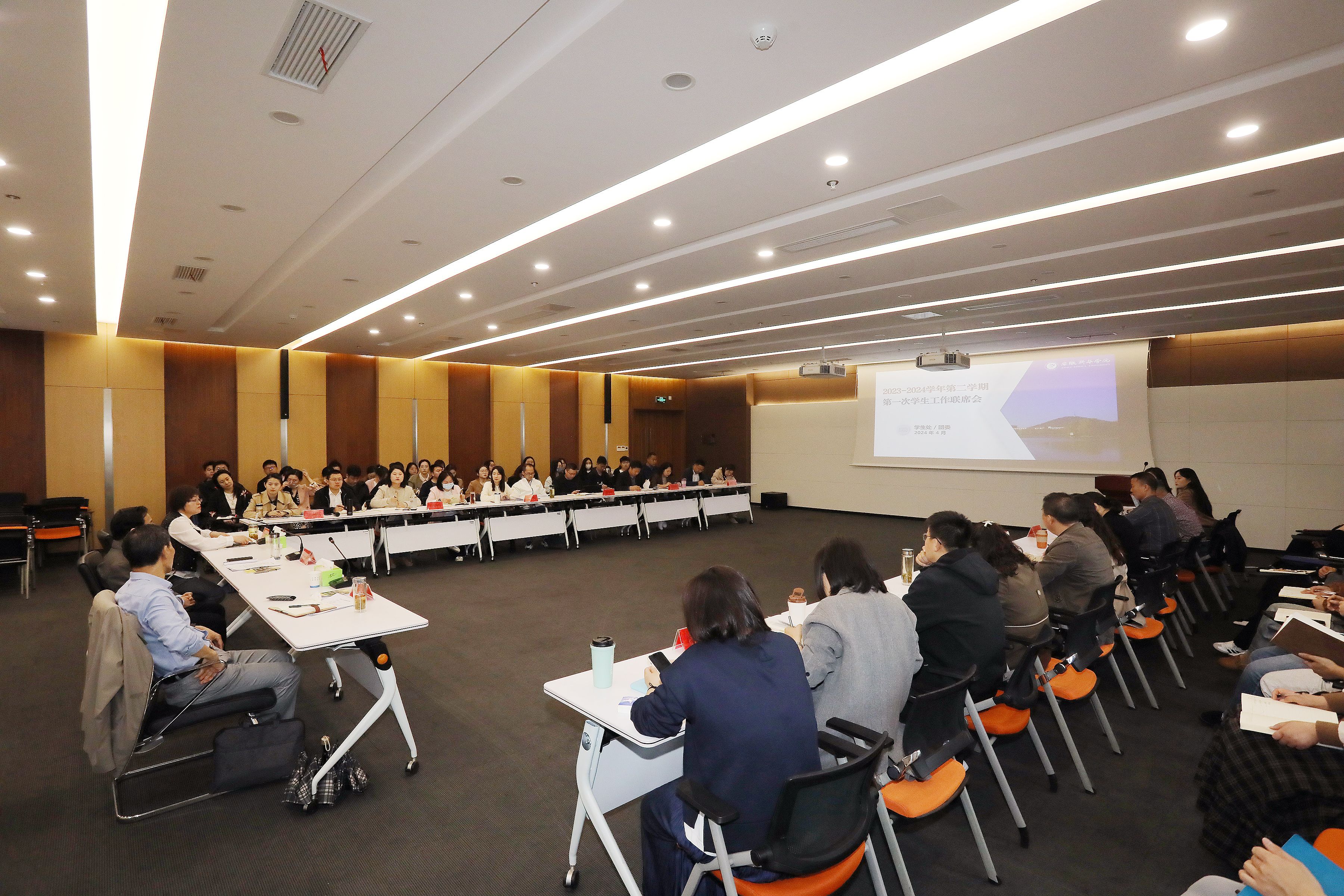 本网讯(通讯员:王强亚 靳荟民 摄影:翟漱文)4月2日上午,学生处/团委在科研楼一楼多功能厅组织召开2023-2024学年第二学期第一次学生工作联席会。省督导专员、校党委书记邸建伟、校长助理邵玲,辅导员发展研究中心主任朱平、各二级学院执行院长、分管学生工作副院长/院长助理、教务处、学生处/团委、保卫处、校友工作办公室部门负责人,学生处/团委全体人员以及各二级学院学管秘书、行政秘书、辅导员代表参加会议,会议由邵玲主持。