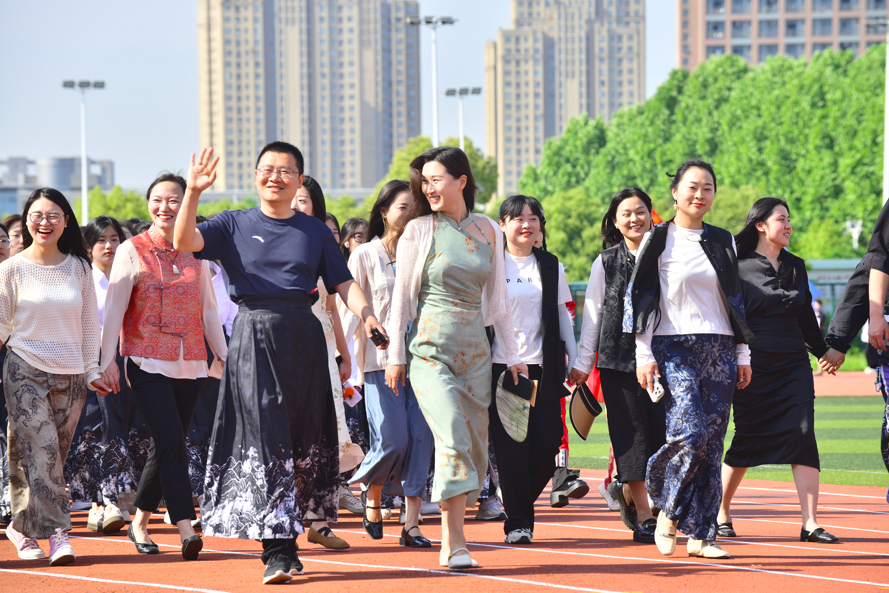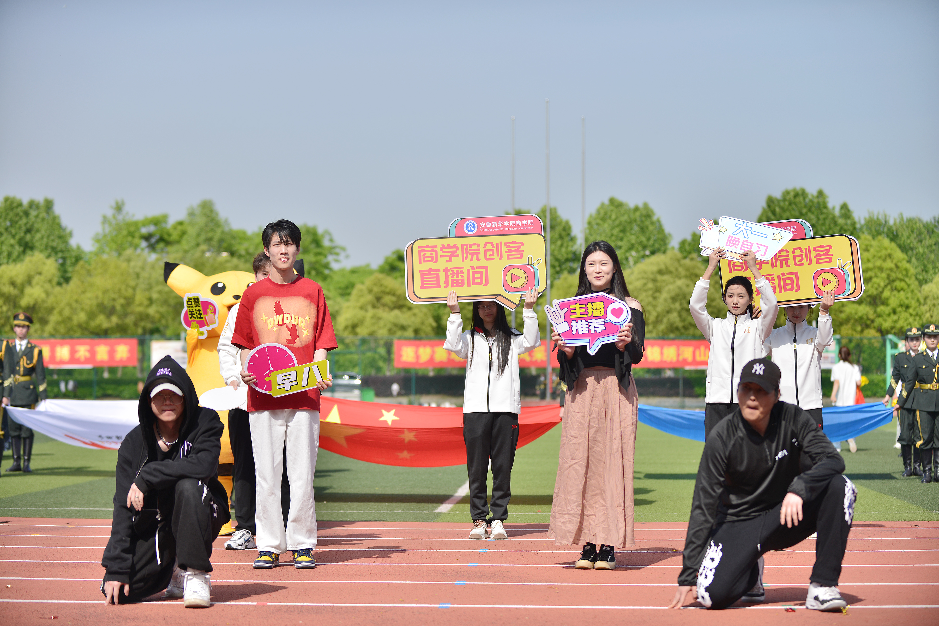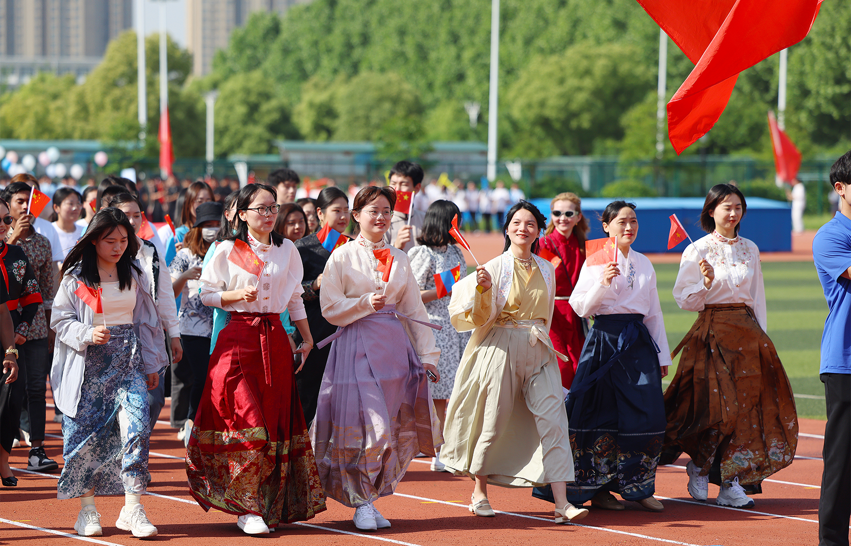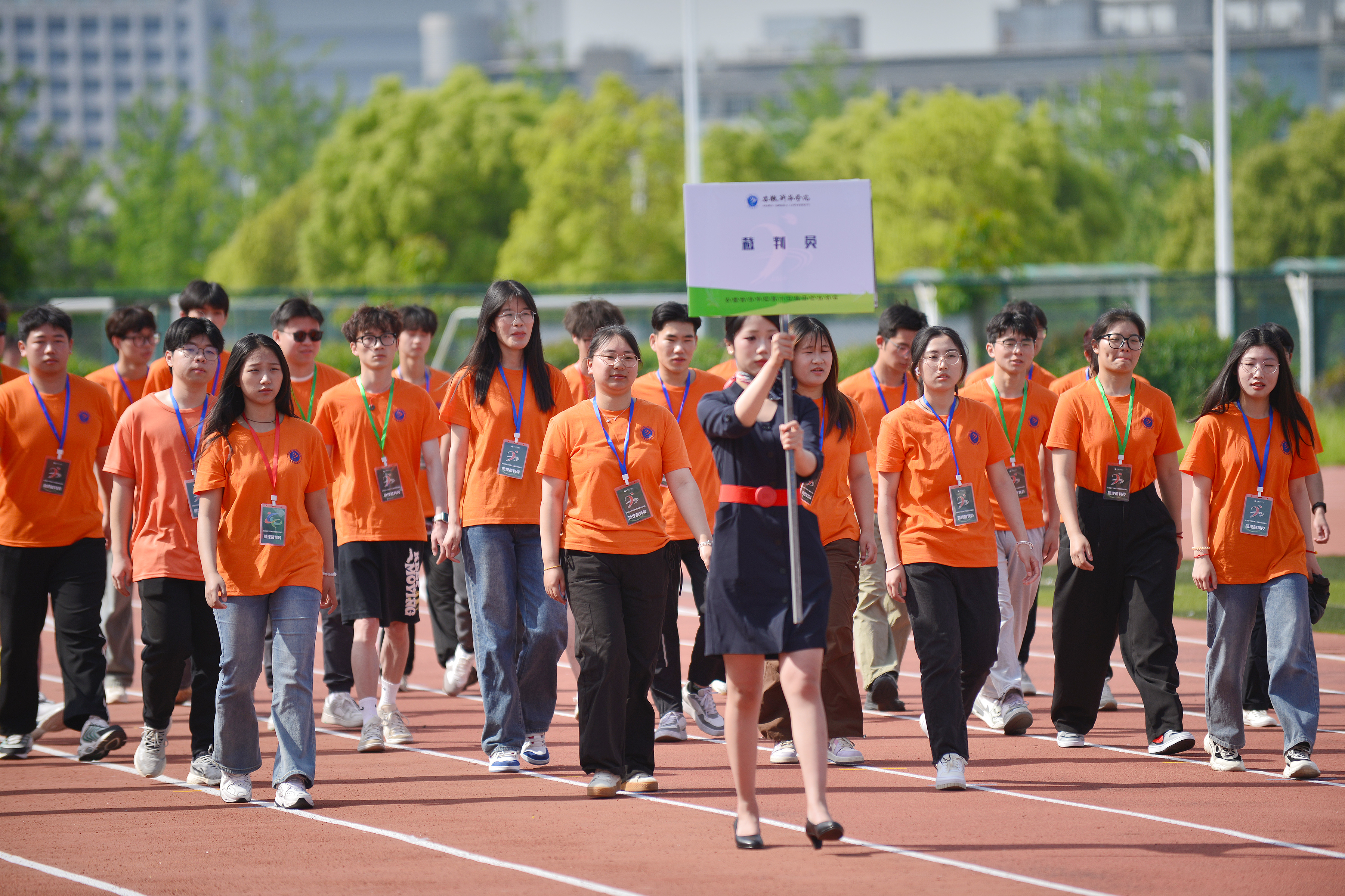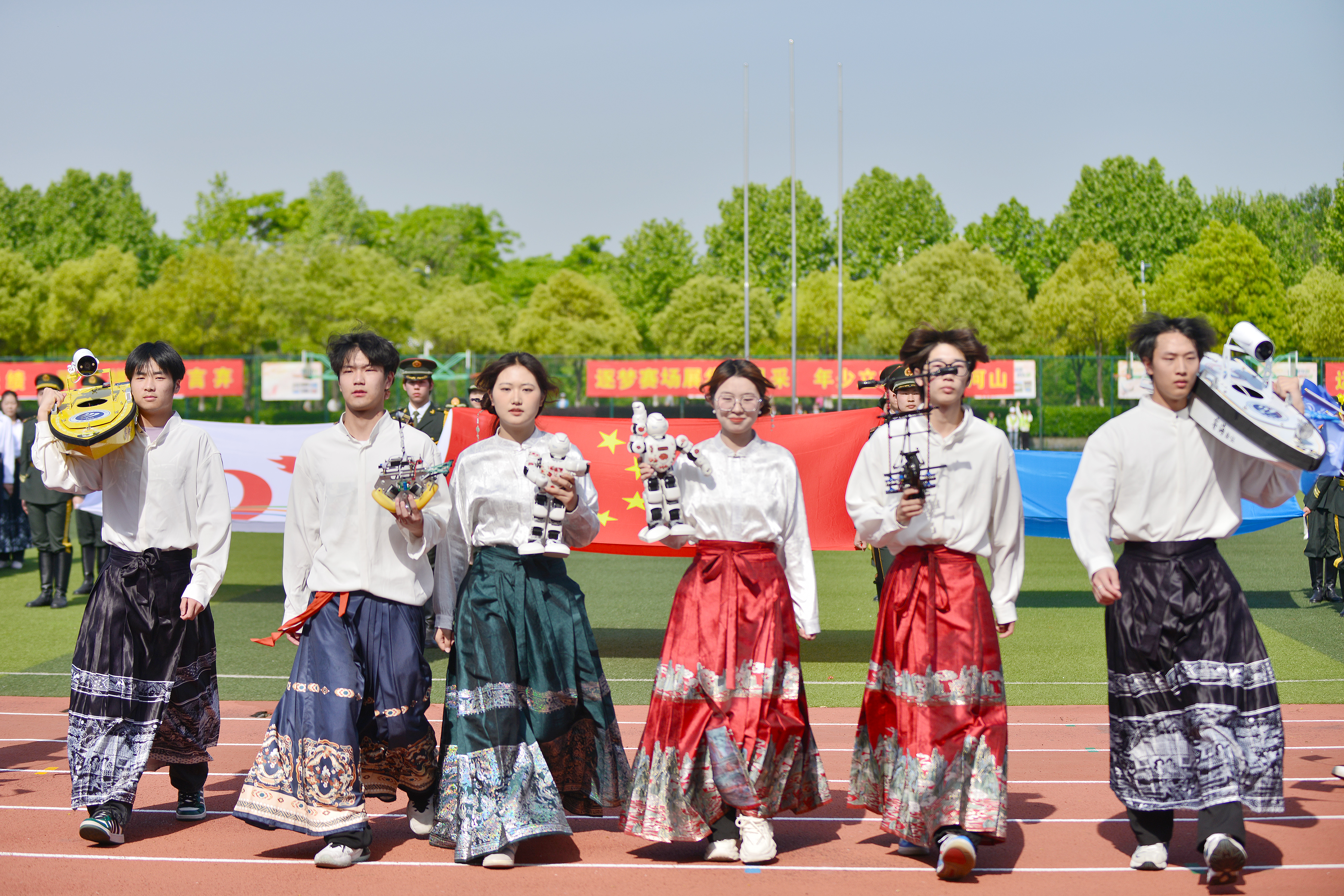 随后,各二级学院代表队依次入场。运动场上,他们朝气蓬勃、步伐整齐,怀着坚定的信念,向“更快、更高、更强”的目标迈进。首先入场的是财会与金融学院方阵,他们手持红橙相间的古典舞扇,以朝气蓬勃的姿态,展现出“融通四海,才满天下”的青春风采。文化与传媒学院代表队身着各民族服饰生动再现了华夏底蕴的深厚涟漪。外国语学院/国际教育学院方阵队伍中,外国留学生的民族服饰与学工队伍传统服饰交相辉映,憨态可掬的玩偶演员们带着《猪猪侠》主题曲闪亮登场,共同演绎一场力与美的精彩盛宴,将学院文化的深厚底蕴与中西文化的交融之美展现得淋漓尽致。电子工程学院/智能制造学院学子意气风发,将无人艇、无人机、无人车、机器人等“课堂作业”搬到了体育场。大数据与人工智能学院的轮滑选手们手举旗帜先一步入场,身着蓝色短袖的“气球大军”在舞动中一齐放飞气球,将开幕式推向高潮。“3、2、1,上链接!”,商学院带着直播设备开展了一场时髦又不失幽默的街舞“直播”。