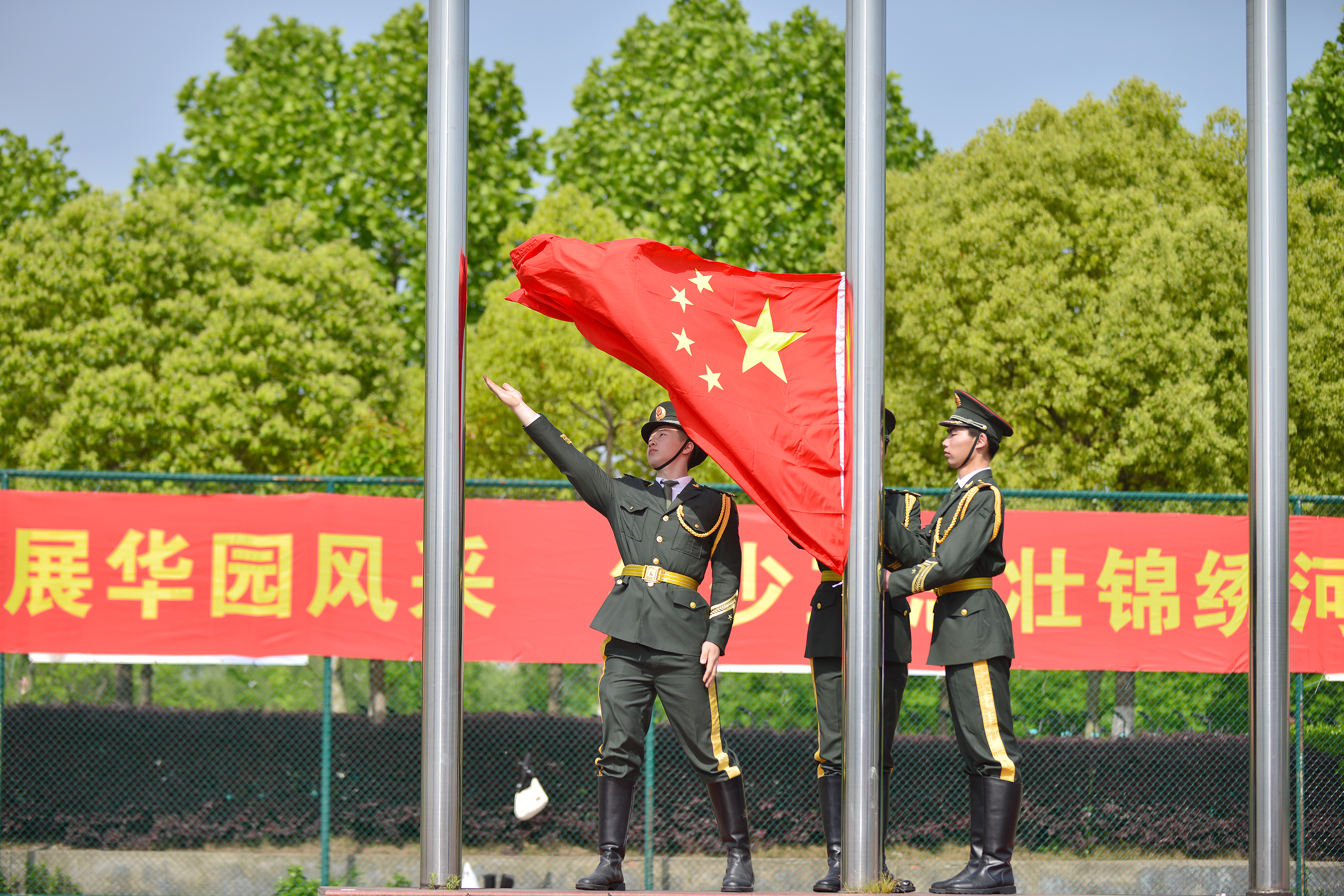 旭日东升,国旗奏响,鲜艳的五星红旗在校园上空飘扬,师生们庄严肃立,迎风挺立,用洪亮的歌声表达着对祖国的敬爱和忠诚。