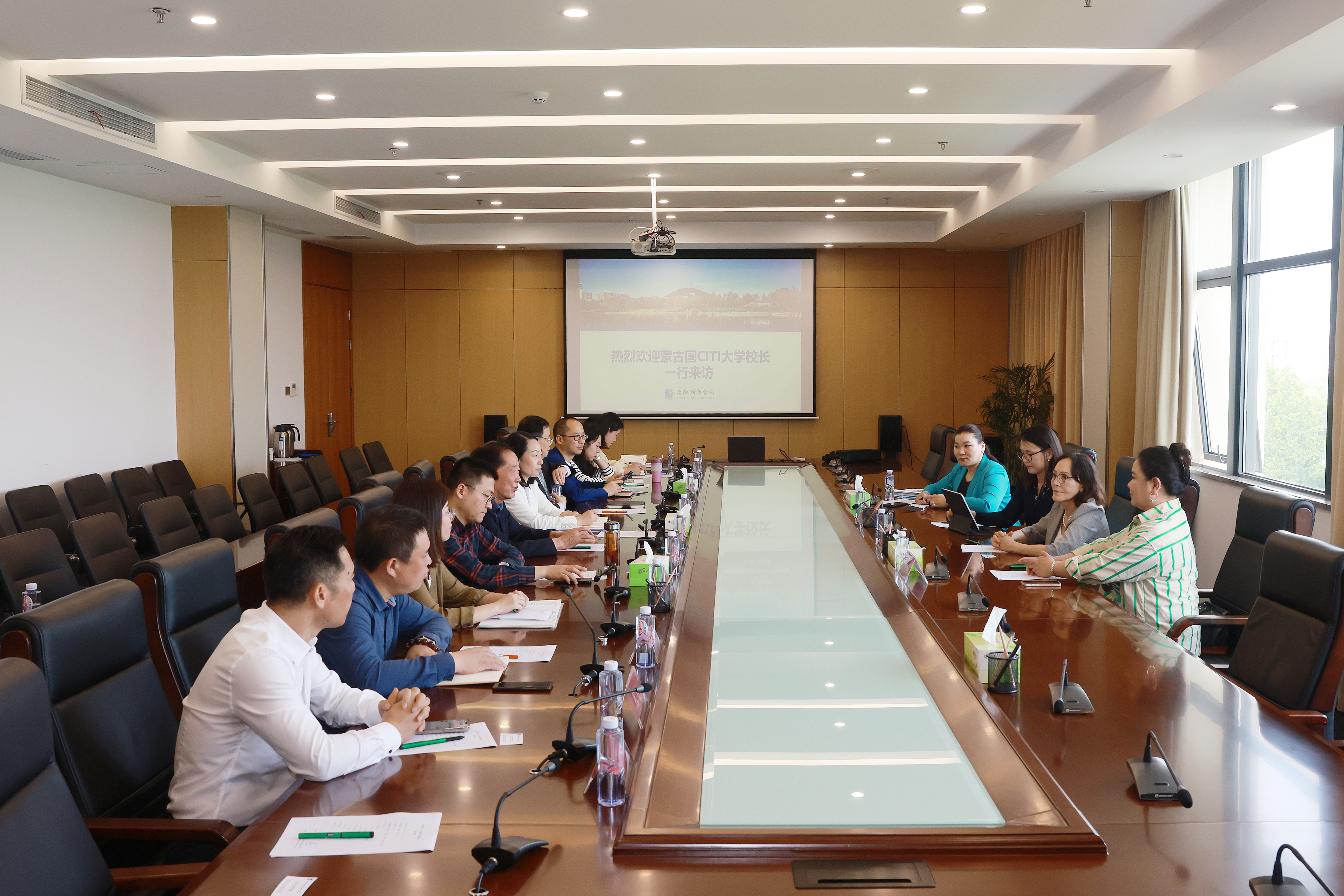 本网讯(通讯员:王艺霖 摄影:翟漱文)5月7日,蒙古国CITI大学校长白嘎丽玛、研究生院院长清谷、国际交流合作处处长阿力玛、艺术学院影视表演系主任孟和图雅一行四人到访beat365网登。安徽新华学院董事长储国定、常务副校长王丽及校长助理王琦进、国际交流合作处、学生处、财会与金融学院、商学院、文化与传媒学院、城市建设学院和艺术学院等相关负责人参加了洽谈会。
