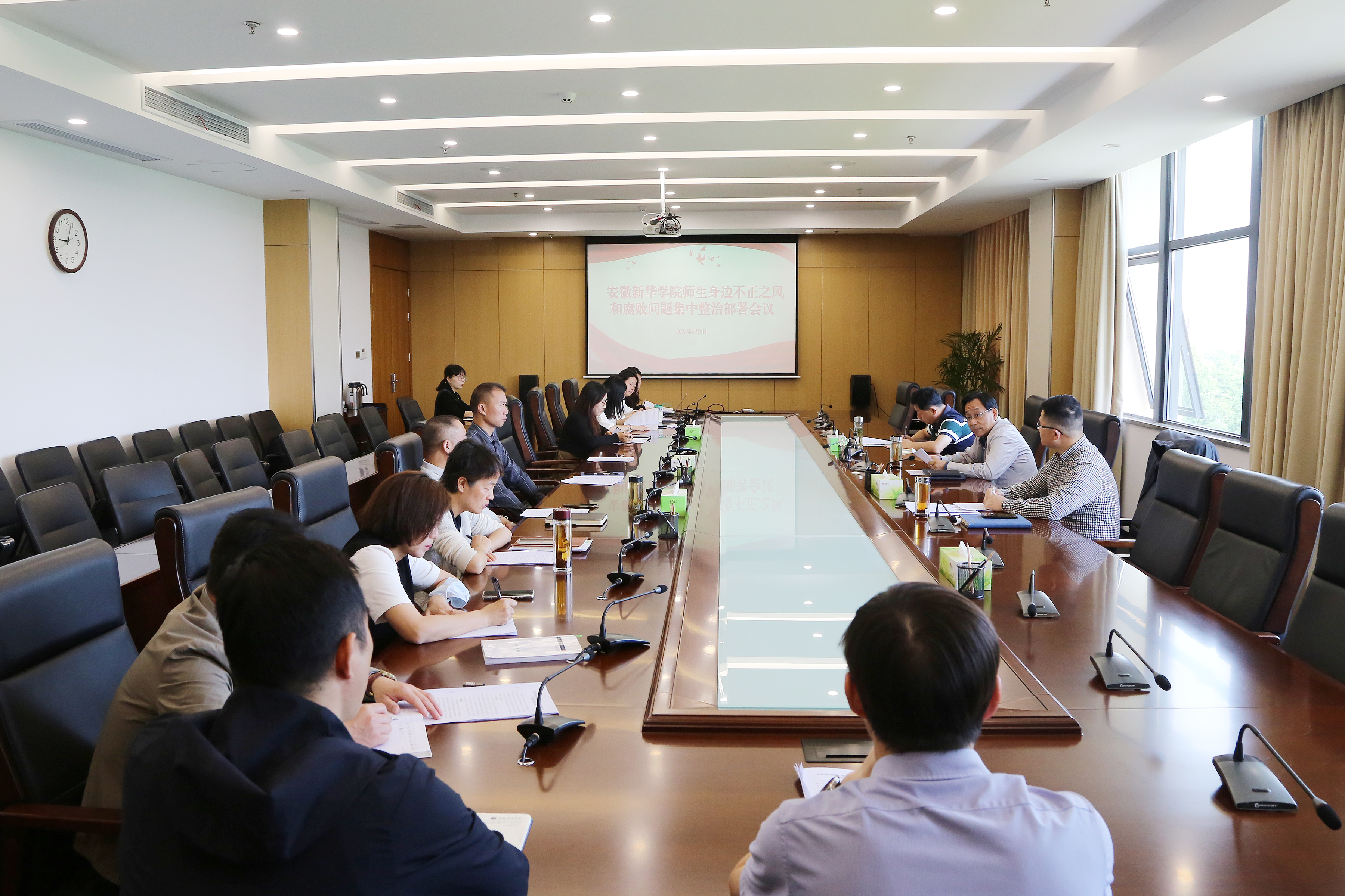 会议的主要任务是深入学习贯彻4月28日召开的全省教育领域群众身边不正之风和腐败问题集中整治推进会会议精神,凝聚思想共识,全面部署beat365网登集中整治工作。首先,与会人员学习了中共安徽省委教育工委、安徽省教育厅印发的《开展全省教育领域群众身边不正之风和腐败问题集中整治实施方案》文件精神。贺行佳宣读了《开展beat365在线体育官网登录入口师生身边不正之风和腐败问题集中整治实施方案》,并对相关工作进行部署。