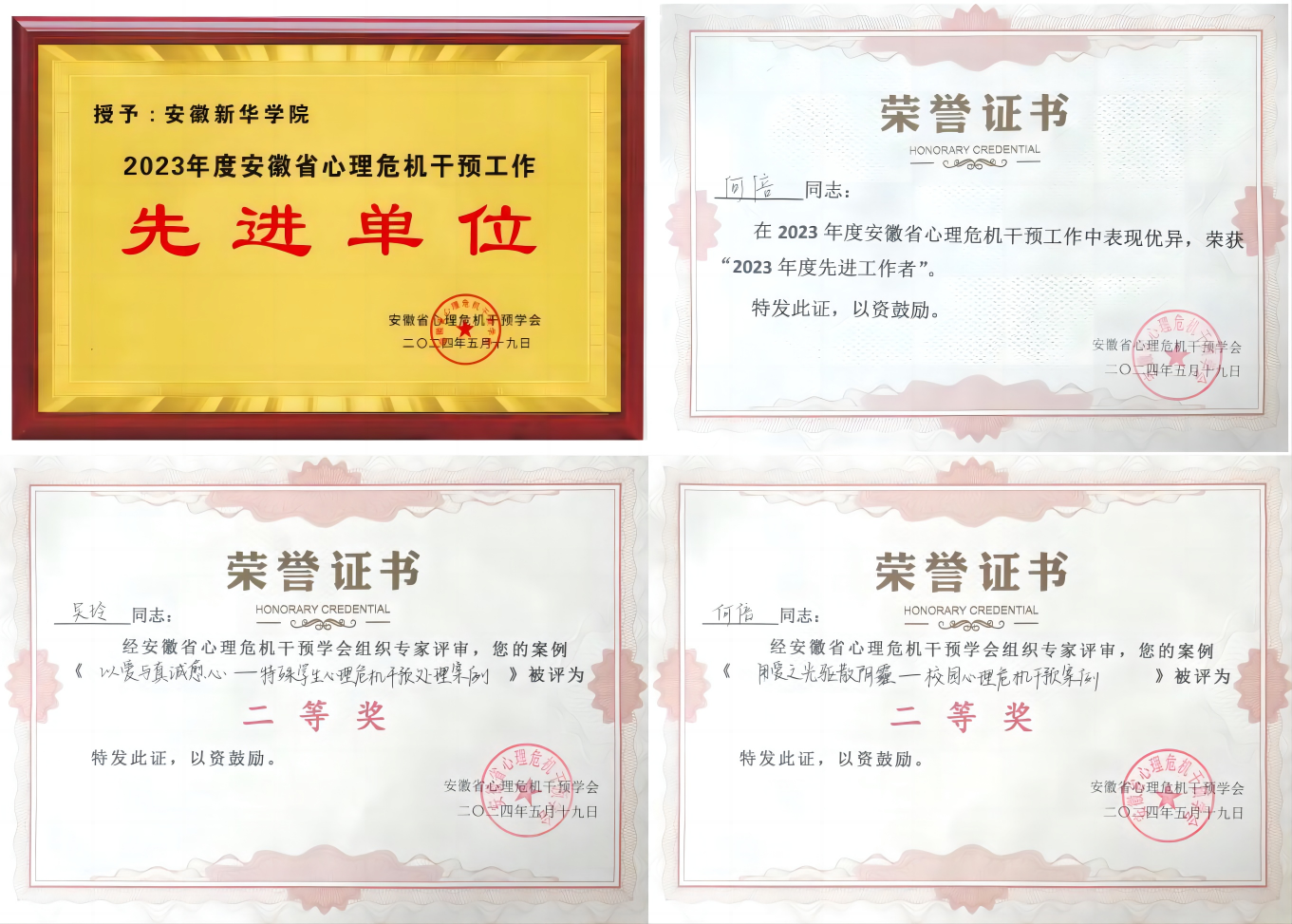 本网讯(通讯员:吴玲)2024年5月18日至19日,安徽省心理危机干预学会2024学术年会暨心理危机干预技能专题培训在合肥市恒悦外商俱乐部酒店隆重召开。校长助理邵玲带领学校心理健康教育中心及各二级学院心理工作教师代表参与此次会议。经过申报和学会评选,beat365网登获“2023年度安徽省心理干预工作先进单位”荣誉称号,beat365网登何倍老师获评“2023年度先进工作者”,何倍和吴玲老师提交的心理工作案例荣获优秀案例二等奖。