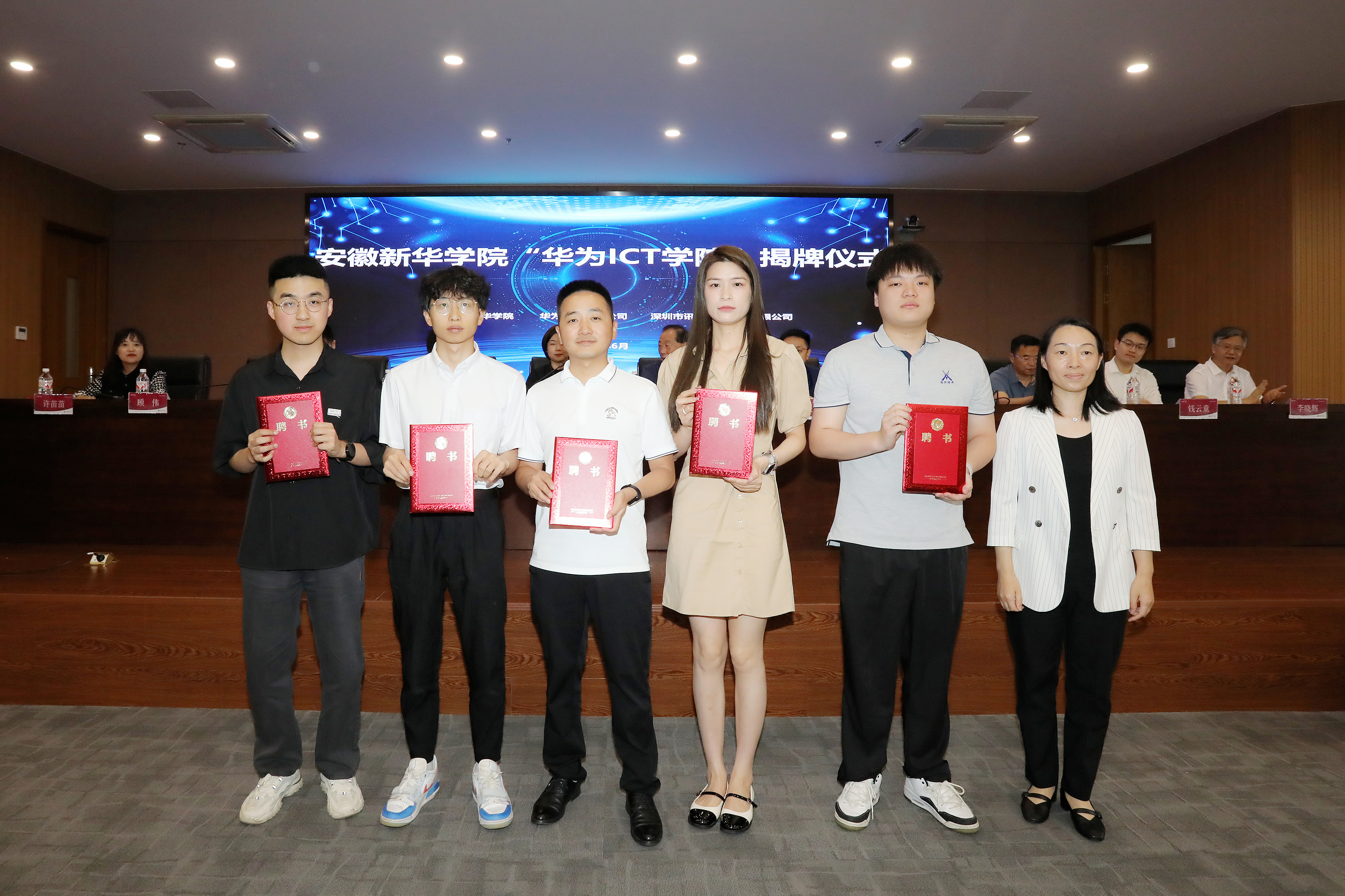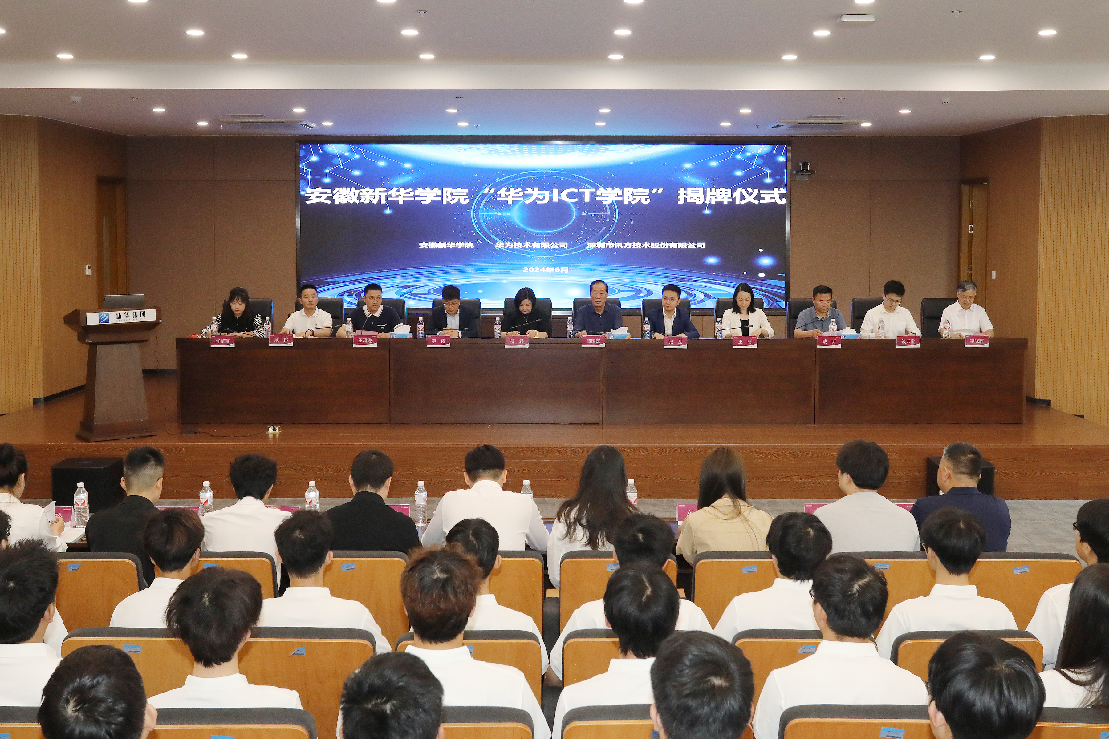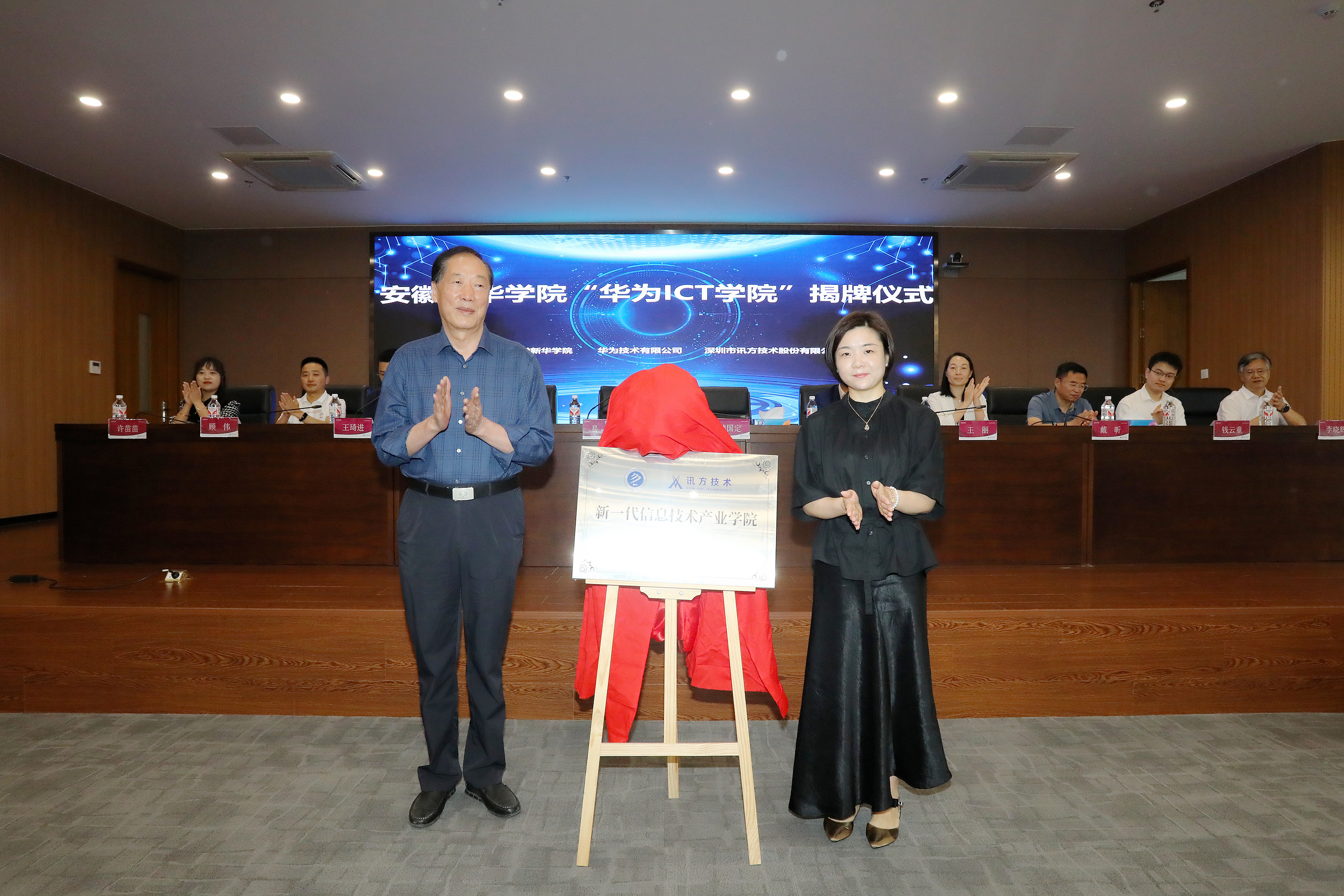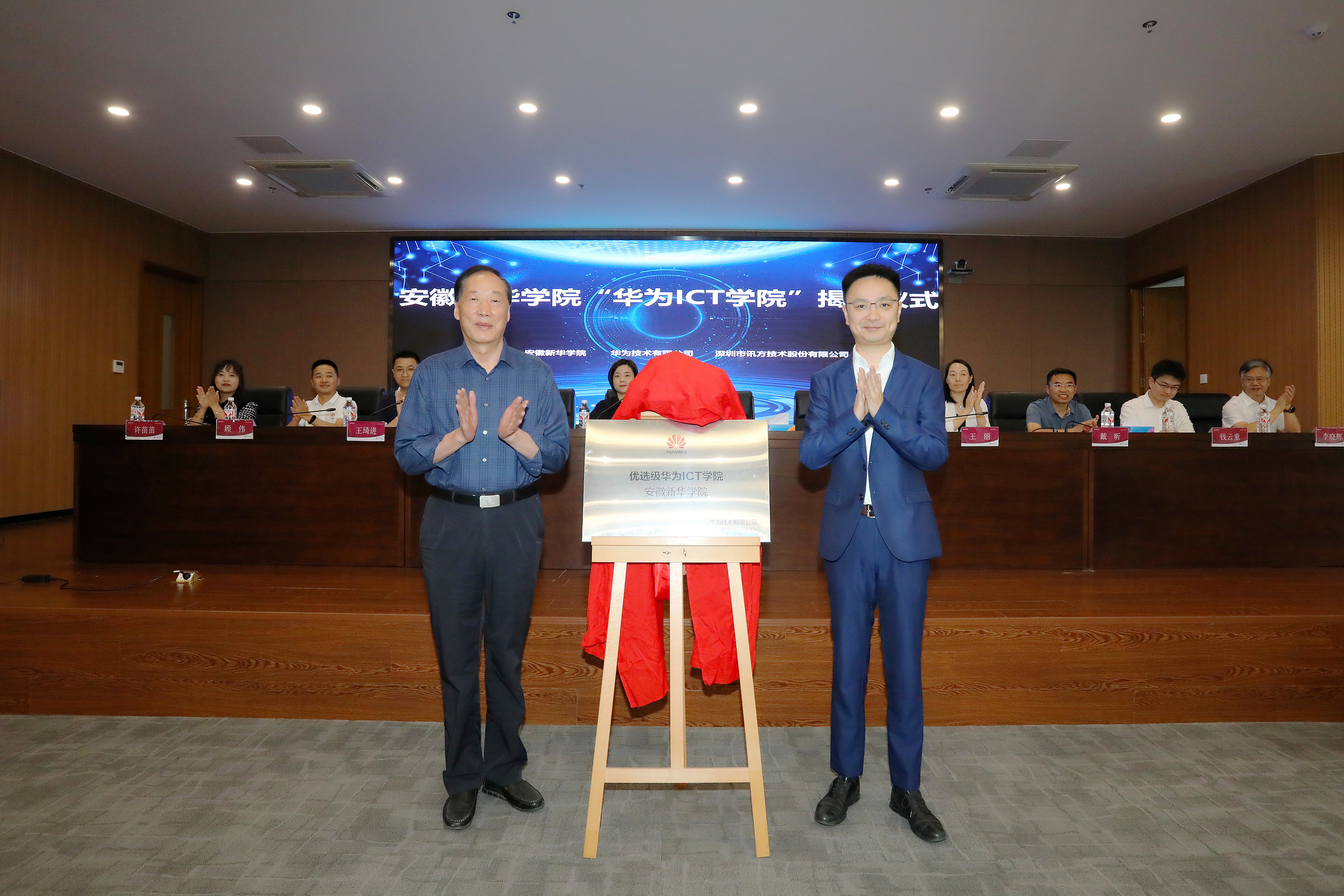 本网讯(通讯员:孙美玲)6月5日,beat365在线体育官网登录入口电子工程学院/智能制造学院在科研楼多功能厅举行了“华为ICT学院”暨新一代信息技术产业学院揭牌仪式。beat365在线体育官网登录入口董事长储国定、常务副校长王丽、副校长戴昕、校长助理王琦进;华为安徽产业发展与生态部总经理张磊、华为安徽政企业务部合肥教育总经理李涛、华为合肥昇腾人工智能生态创新中心运营总监钱云童;深圳市讯方技术股份有限公司华中片区总经理易君、安徽省区总监顾伟;电子工程学院/智能制造学院院长李晓辉、执行院长许苗苗等教职工、学生代表,以及华为和讯方相关部门负责人和工程师出席了会议。
