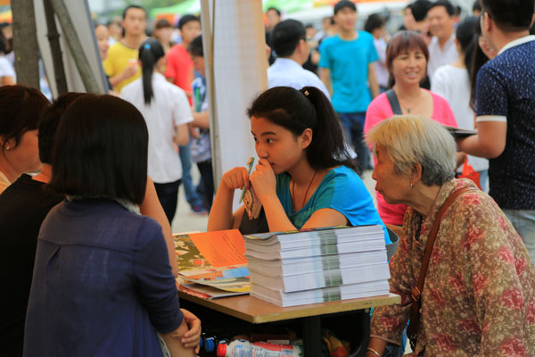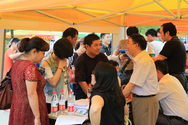 校园内彩色的帐篷沿着校园环形路整齐排放着,各高校的招生展台装饰得很精致,纷纷把各校的亮点和优势展现出来吸引考生和家长。30000多名从全省各地市纷至沓来的考生和家长聚集在一张张展台前,仔细询问自己关心的问题。各高校的招生代表面对考生和家长的争相提问,都在耐心介绍本校的情况以及今年的招生政策,站在后面听的考生认真记录下报考院校的相关信息。