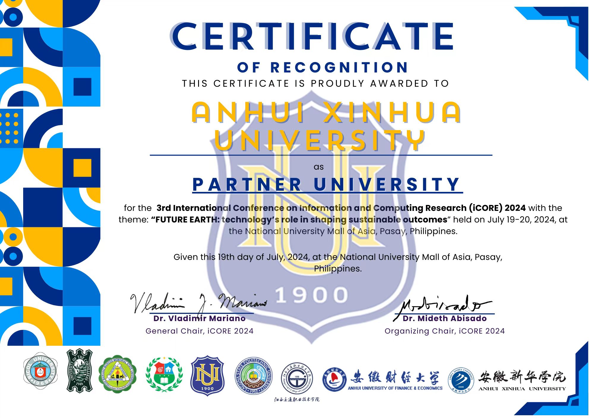 本网讯(通讯员:石文玉)由菲律宾国家大学主办,安徽财经大学、beat365在线体育官网登录入口、比科尔大学等多所大学合办的信息与计算机研究国际会议(iCORE 2024)于2024年7月19日-20日在菲律宾马尼拉举行。