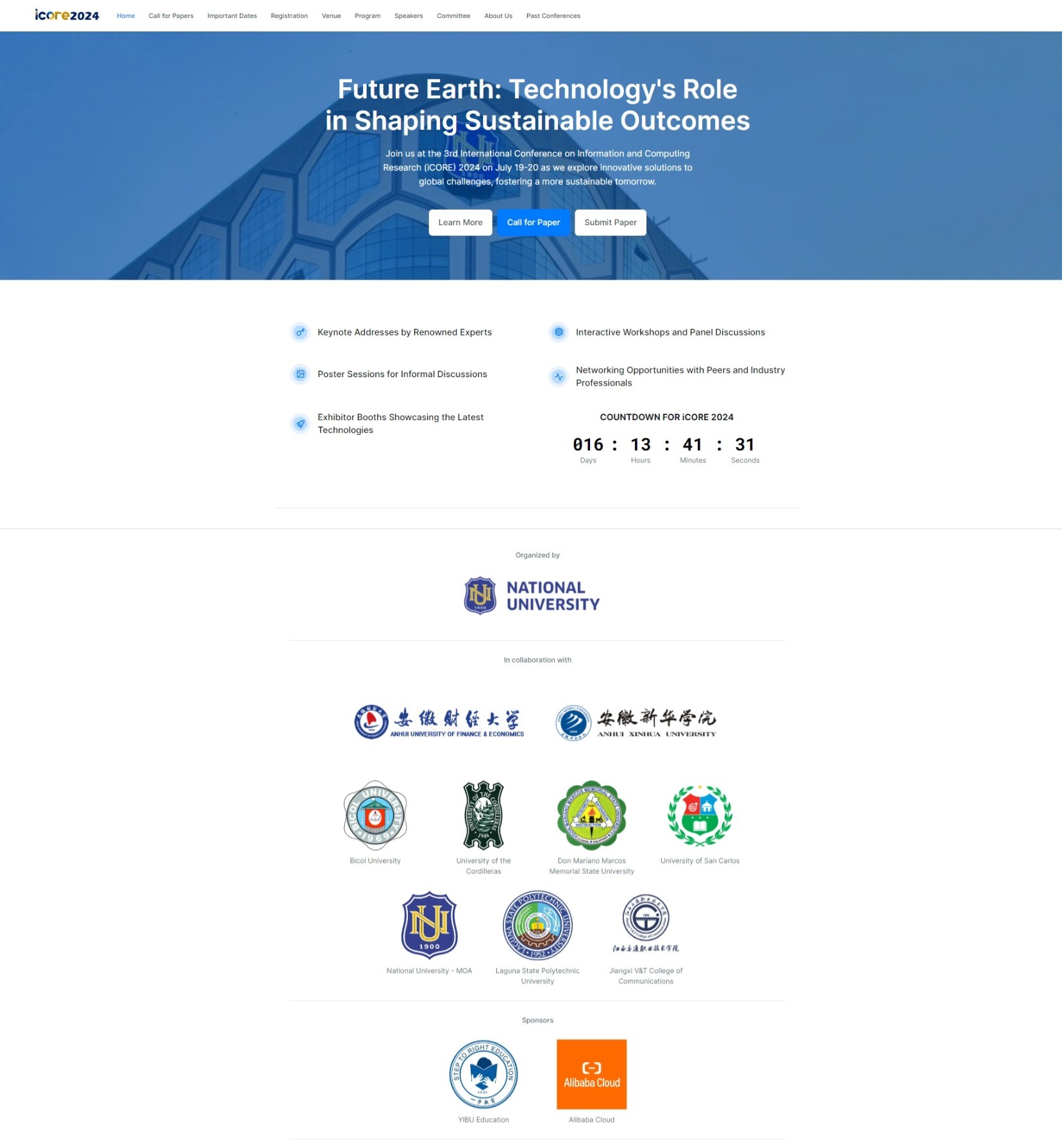 信息与计算研究国际会议 (iCORE) 是计算机科学、信息技术和相关领域的重大活动。iCORE的核心是致力于促进跨学科合作和突破知识的界限。会议范围涵盖广泛的主题,致力于反映该领域技术的多面性。从基础算法和数据结构原理到新兴技术,包括人工智能、机器学习和物联网等。该会议是展示原创研究的论坛,并促进对于技术快速发展的相关社会影响和伦理考虑等方面的深刻讨论。自创办以来,该会议一直是信息技术研究、技术交流及行业合作的重要平台,目前已经举办到第3届。本次会议围绕“未来地球:技术在塑造可持续成果中的作用”主题,设置了“主旨演讲”“海报展示”“小组研讨”等多个模块。会议将汇集来自世界各地的学者、研究员、行业专家等,为交流不断发展的领域前沿思想和进步创造一个有力的平台。