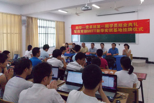 7月3日上午,电子通信工程学院举行了新华—安卓第一期校企合作班结业典礼暨教育部MITT实训基地挂牌仪式。全体第一期、第二期安卓班学员共55名同学参加了典礼。其中第一期28人均为2013届本科毕业生,6月底顺利结业并奔赴工作岗位。他们在拿到本科毕业证、学位证的同时,也拿到了安卓班结业证书和三网联合移动通信工程师证。