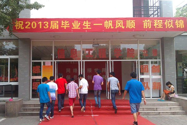 信息工程学院今年共有510名毕业生。为营造良好的离校氛围,学院铺地毯、插彩旗,热烈欢送毕业生奔赴各工作岗位。信息工程学院教学楼前树起两面“墙”,一面是感恩墙,毕业生们把离别之际想对母校和老师说的话留在墙上;另一面是祝福墙,老师们也把自己对毕业生们的祝福传递出来,同学们在楼前看着两面墙,回味着自己求学华园的生活。