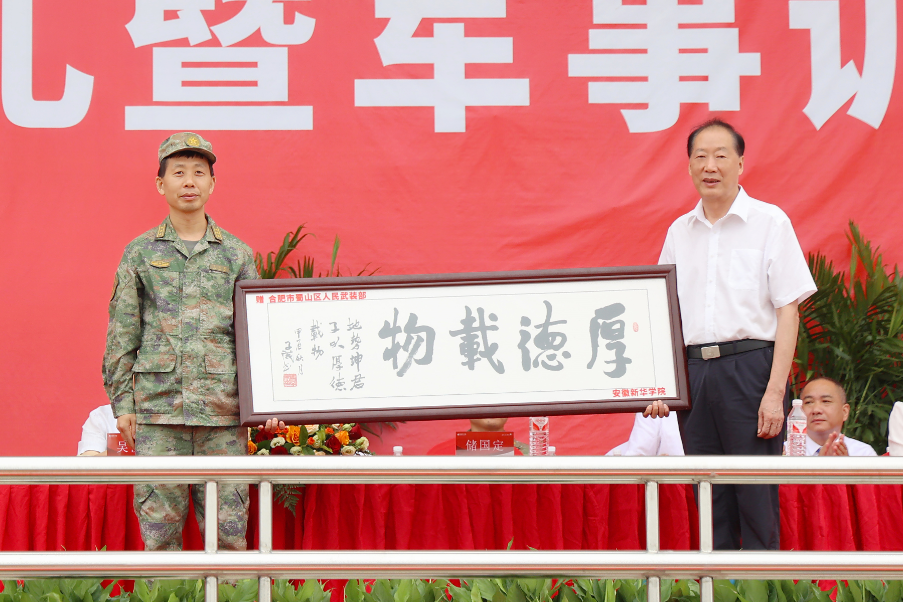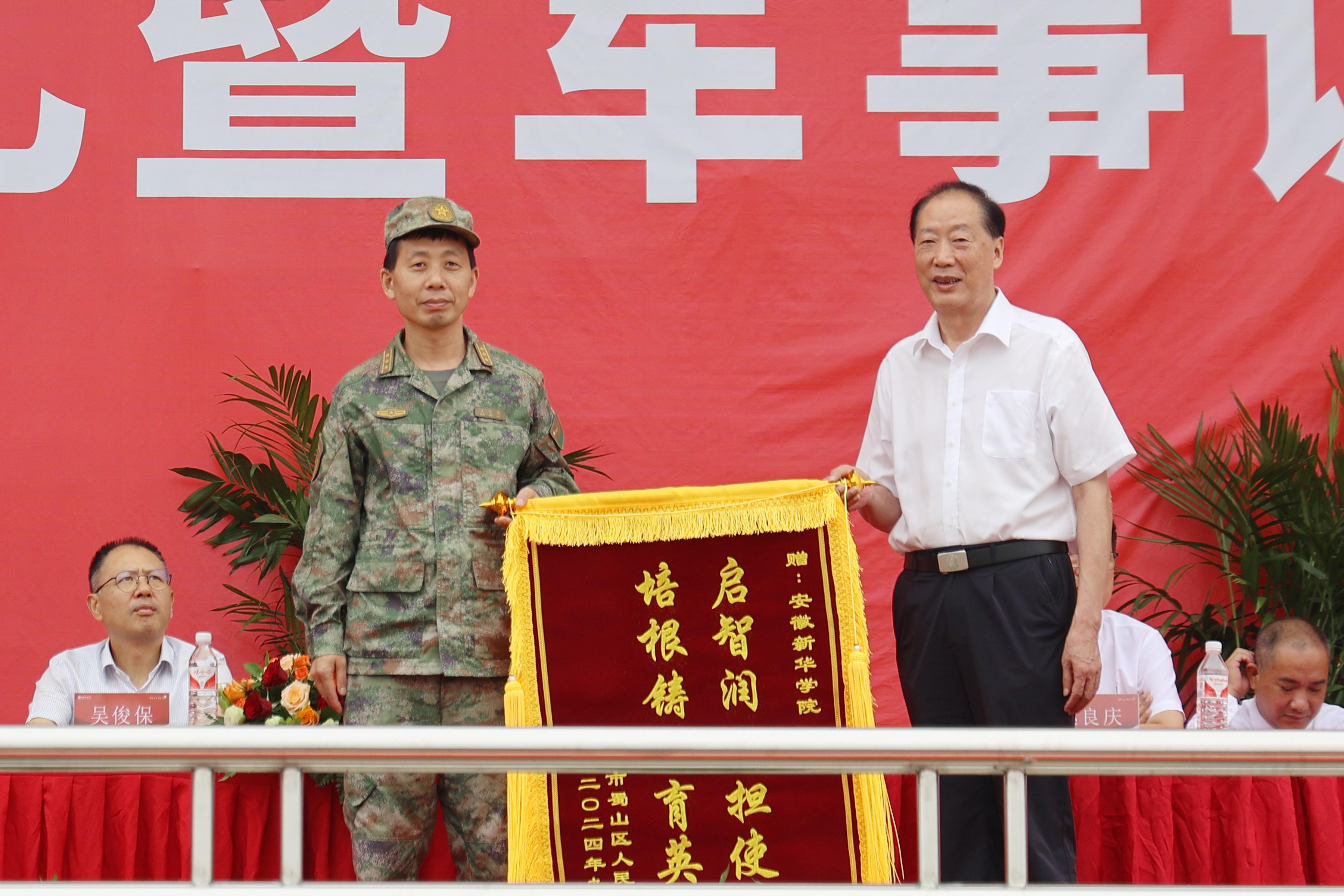 校董事长储国定代表学校向承训部队赠送牌匾,王仁凤代表承训部队向beat365网登赠送锦旗。