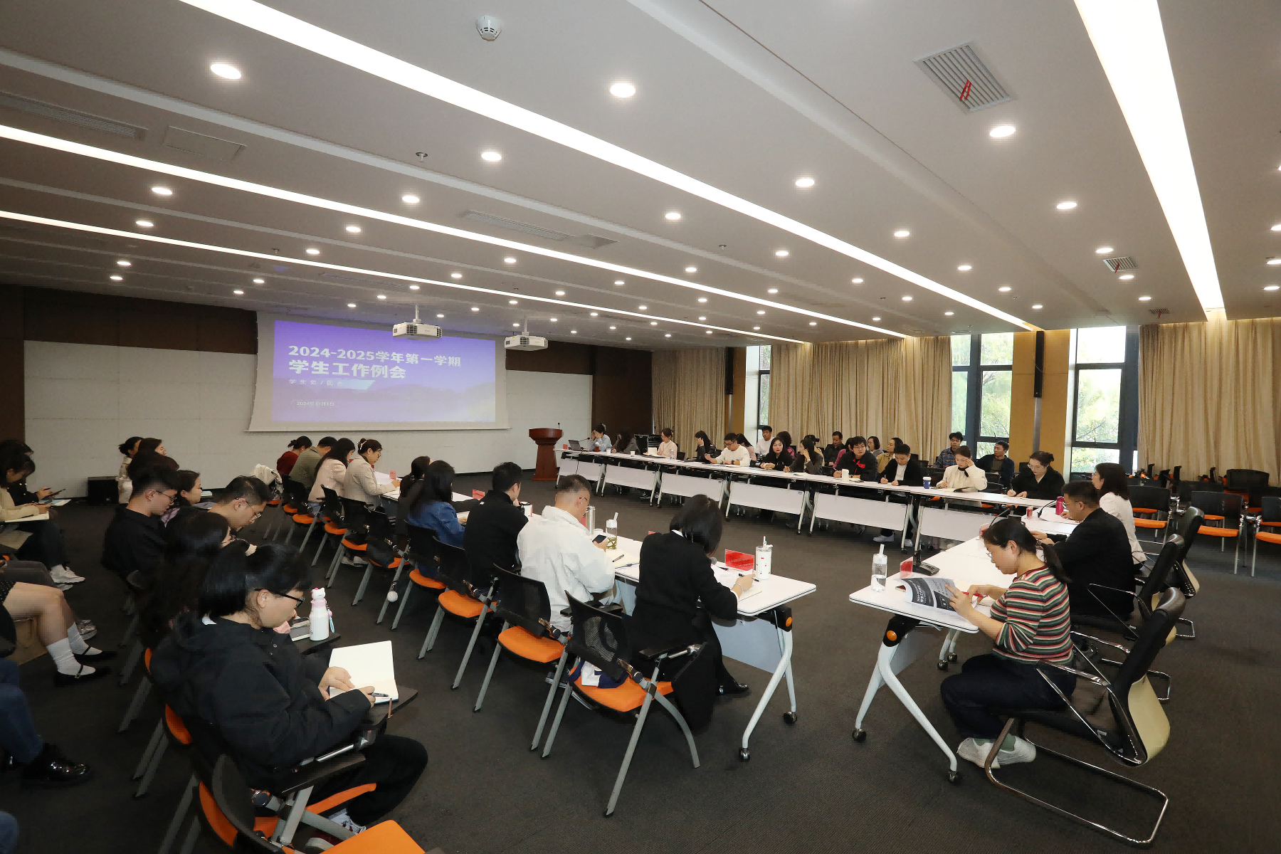 本网讯(通讯员:周刘湘 摄影:翟漱文)11月1日下午,学生处/团委在科研楼一楼多媒体会议室组织召开2024-2025学年第一学期11月份学生工作例会。副校长王琦进、各二级学院分管学生工作副院长/院长助理、学管秘书、行政秘书、辅导员代表及学生处/团委相关人员参加会议,会议由学生处处长芮萍主持。